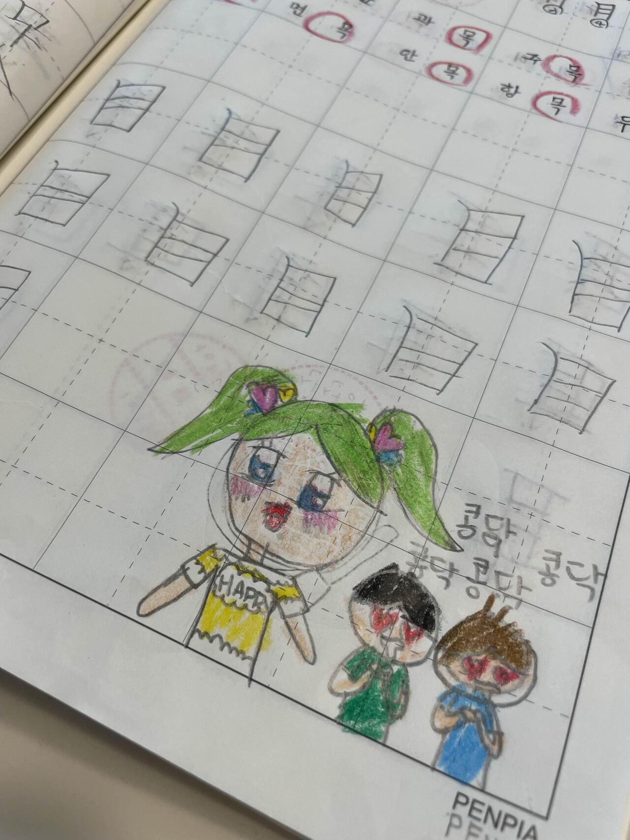 오늘 딸 공책에서 귀여운 그림을 발견했다.