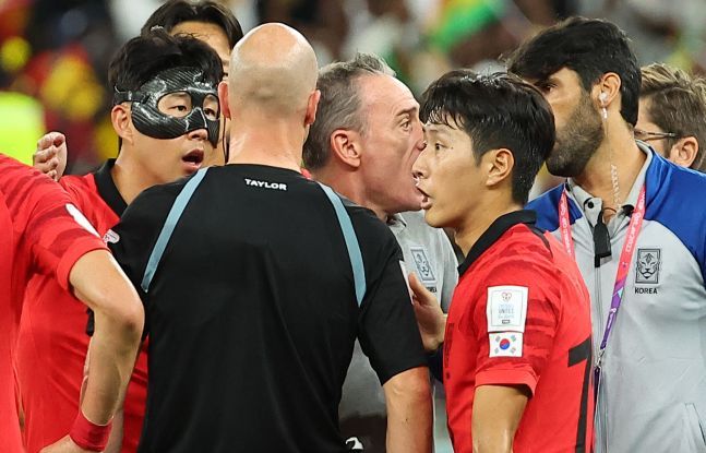 (28일 오후(현지시간) 카타르 알라이얀의 에듀케이션 시티 스타디움에서 열린 2022 카타르 월드컵 조별리그 H조 2차전 대한민국과 가나의 경기가 끝난 손흥민, 벤투 감독, 이강인이 심판 판정에 항의하고 있다.출처 연합뉴스)