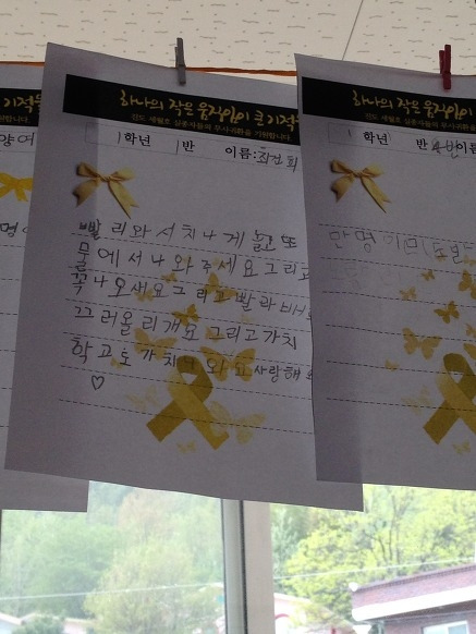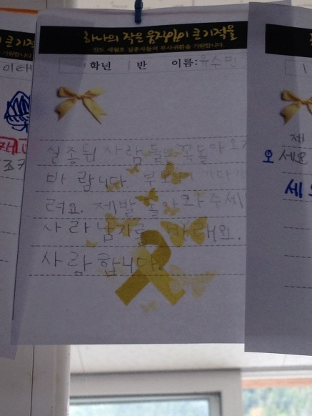 -(헐! 정확하다.) 맞아. 올해 중학교 졸업하고 고등학교 올라간다고 연락 왔더라. 9년 전 그날은 아주 날씨가 맑았던 봄이었어. 1층이던 우리 교실 앞에는 여러 꽃나무들이 가득했는데 그땐 철쭉이 많이 보였던 것 같아. 수업 자료를 찾느라고 인터넷창을 여는데 메인 화면에 빨간색 속보가 뜬 것이 보였어. 서해안 어디쯤에서 배가 가라앉고 있다는 거야. 참. 사람이 무심한 게 그런 빨간 글씨가 뜨니 순간적으로 관심을 갖다가도 내 일 아니니까 다시 수업 자료를 찾으려고 화면을 넘겨버렸지.