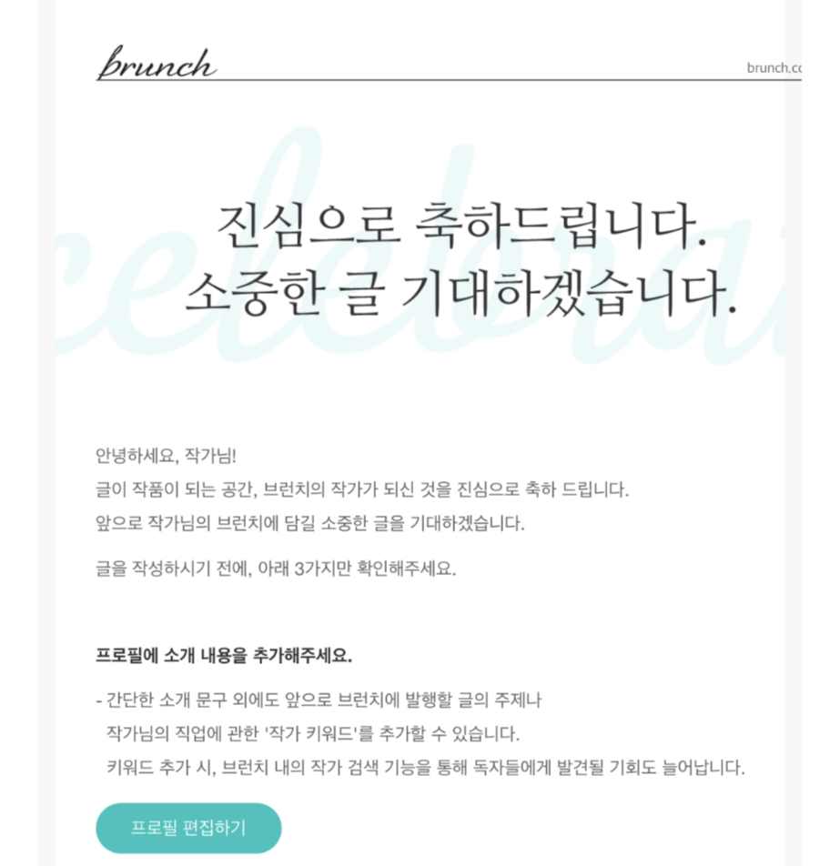 그렇게 또 몇 편의 글이 되고 브런치 작가 신청을 했을 때 며칠 후 작가 선정 메일이 도착했다.