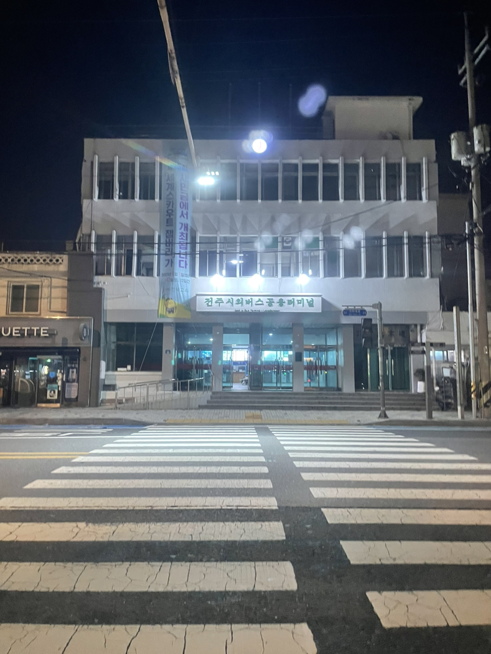 장수에서 7월 30일 자정을 조금 넘긴 시각에 출발하여 전주 시외버스터미널에 가니 불빛이 환했다. 전주시외버스터미널은 내가 중학교 때부터 가던 곳인데 아직도 그 외관 그대로라서 놀랐다. 아들 딸 화장실 따라 가는데 나도 솔직히 무서웠다.