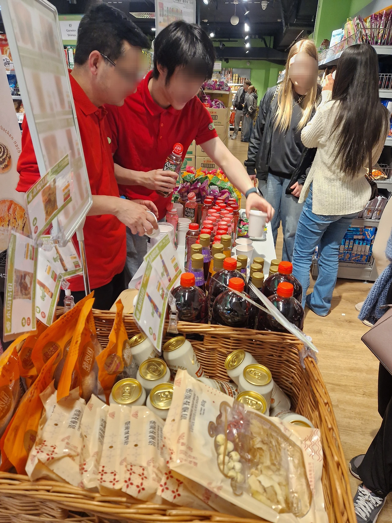 군만두와 음료수등을 시식하는 코너를 마련해 친절하게 교육시킨 직원들이 홍보를 하는 모습은 독일에서는 눈길이 가는 풍경이다.