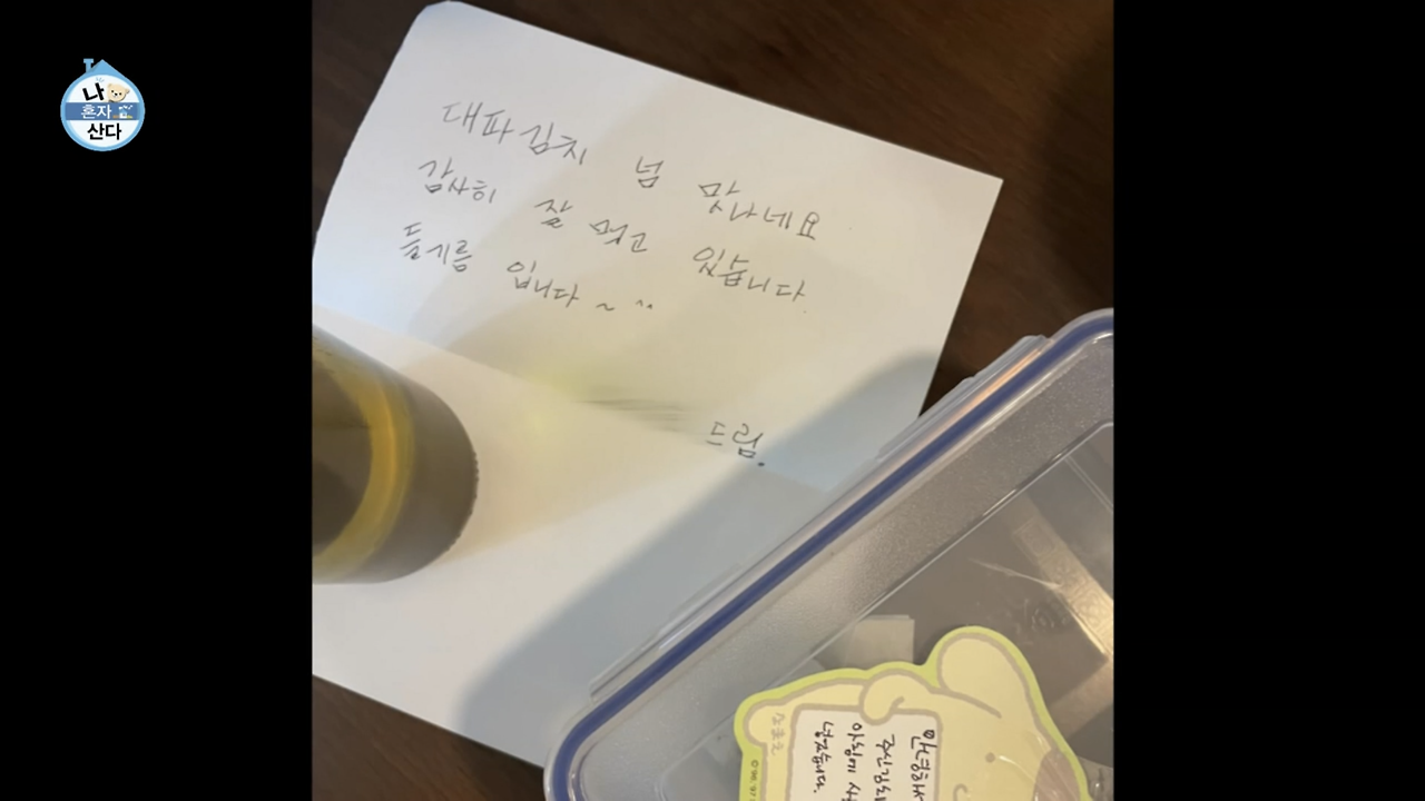 더불어 나혼산 회원들에게 나눠준 레몬딜버터도 있지만, 스케일 큰 작업이었던 ‘대파김치’가 향한 목적지는 더 뇌리에 박혔다. 정성껏 담긴 김치는 쪽지와 함께 윗집, 옆집, 아랫집 문 앞에 놓였고, 이웃들에게 답례 쪽지와 음식들이 돌아온 장면도 그려졌다.