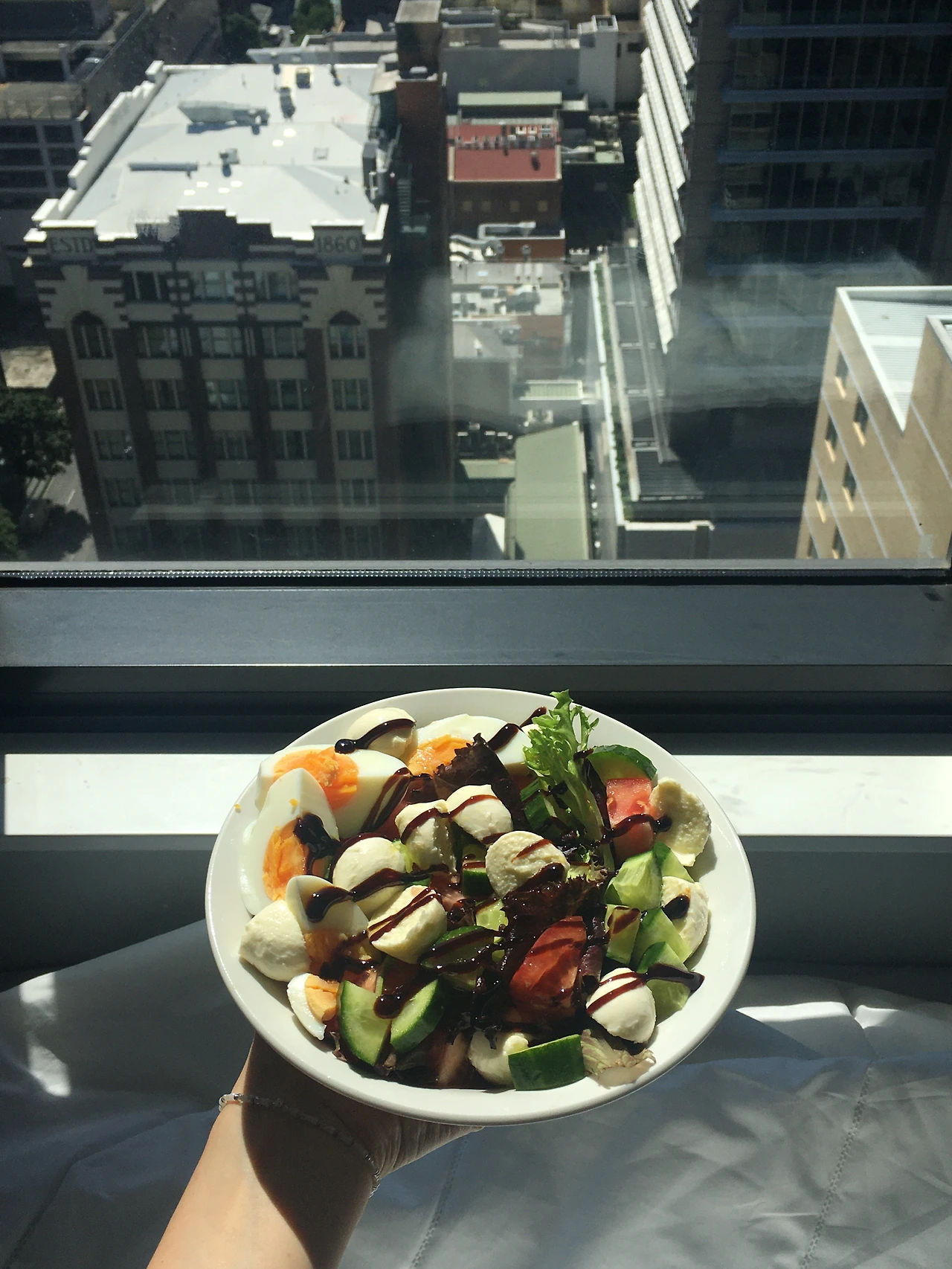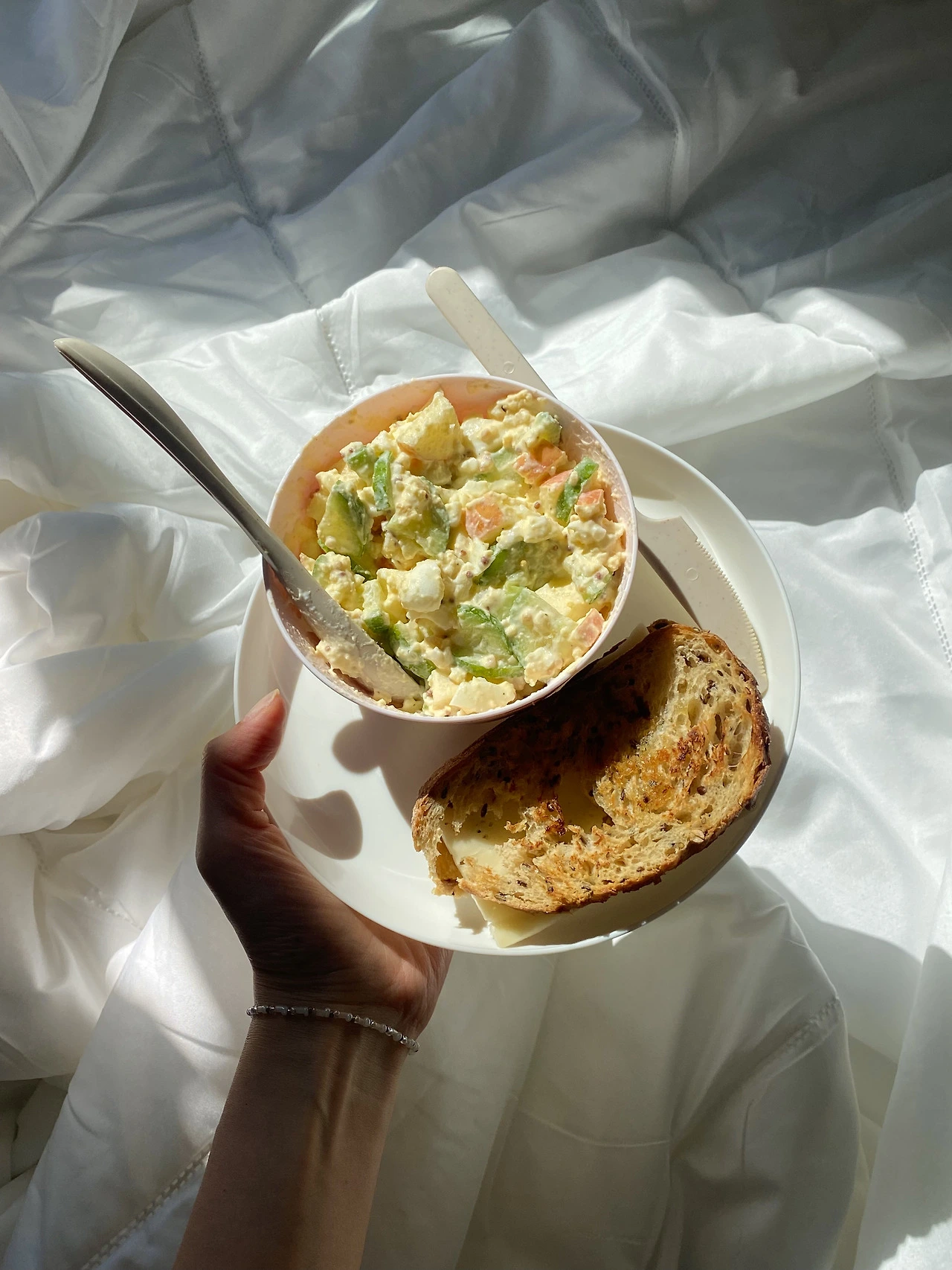 계란 오이 사라다와 프레쉬 과일 토스트, 그리고 보코치니 샐러드