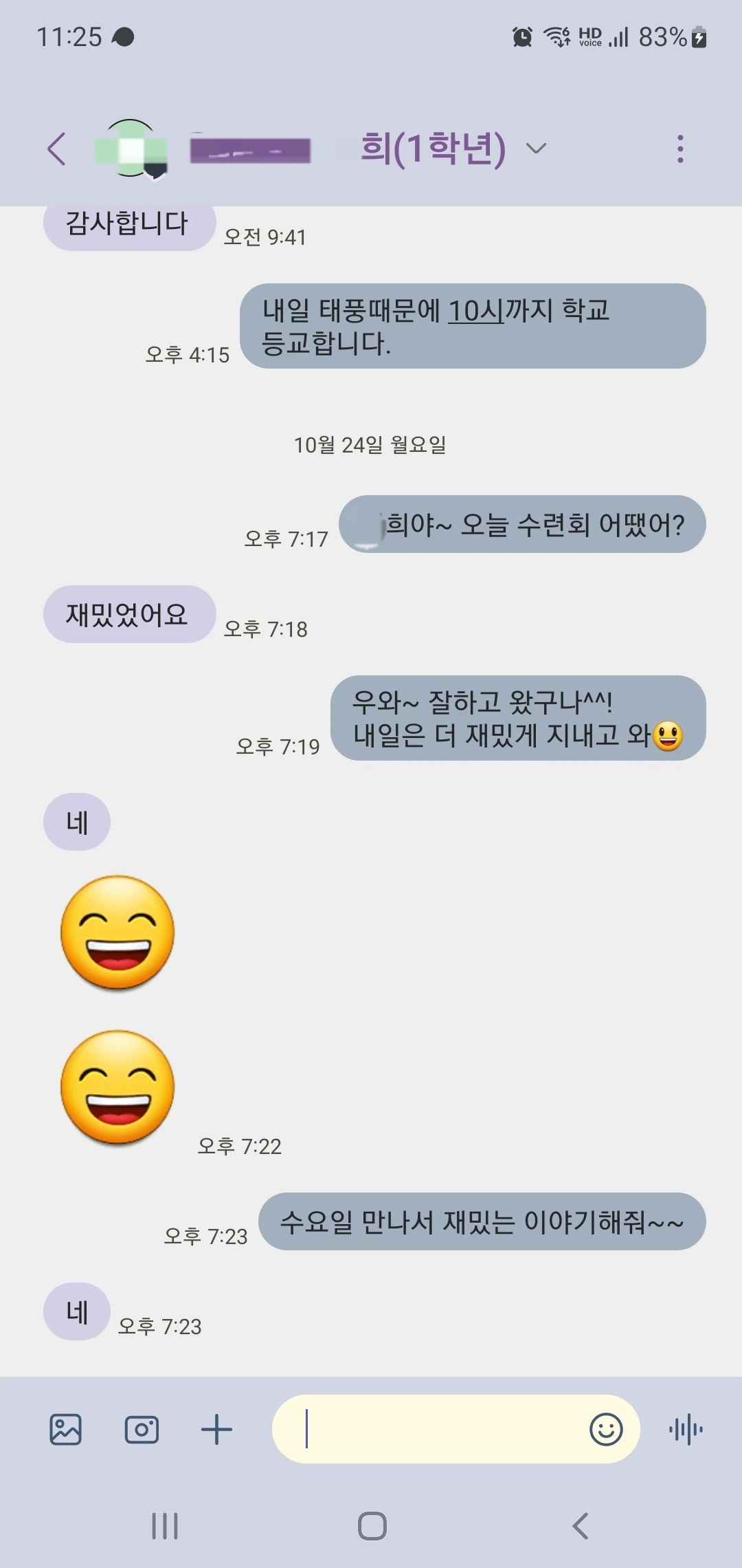 나한테 담임도, 학년부장님도 둘 다 희야가 수련회를 갈 수 있단 이야기를 직접 해주지 않으셨다. (무슨 뒤끝인지.. 급 신경 쓰임..) 두 분 모두 경험이 없으셔서 그랬겠지. 모르셔서 그랬겠지..ㅡㅡ;;;(두 분이 3년 이내 교직경력의 30대 갓 들어선 분들이기에)