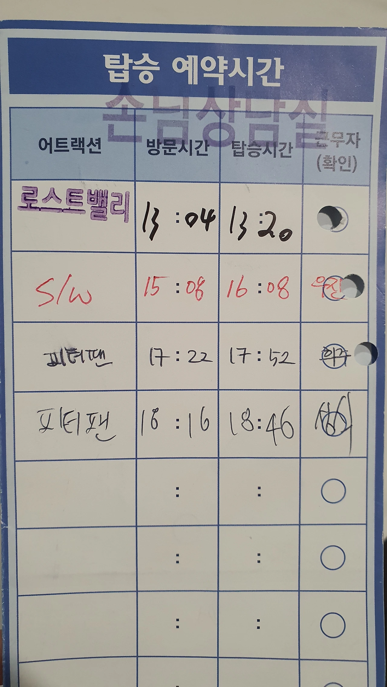 탑승시간을 적어 두는 것이 줄서기를 그 시간까지 한것으로 탑승 예약효과가 있는 것이다. 탑승시간 이후로는 우선 탑승가능했다.