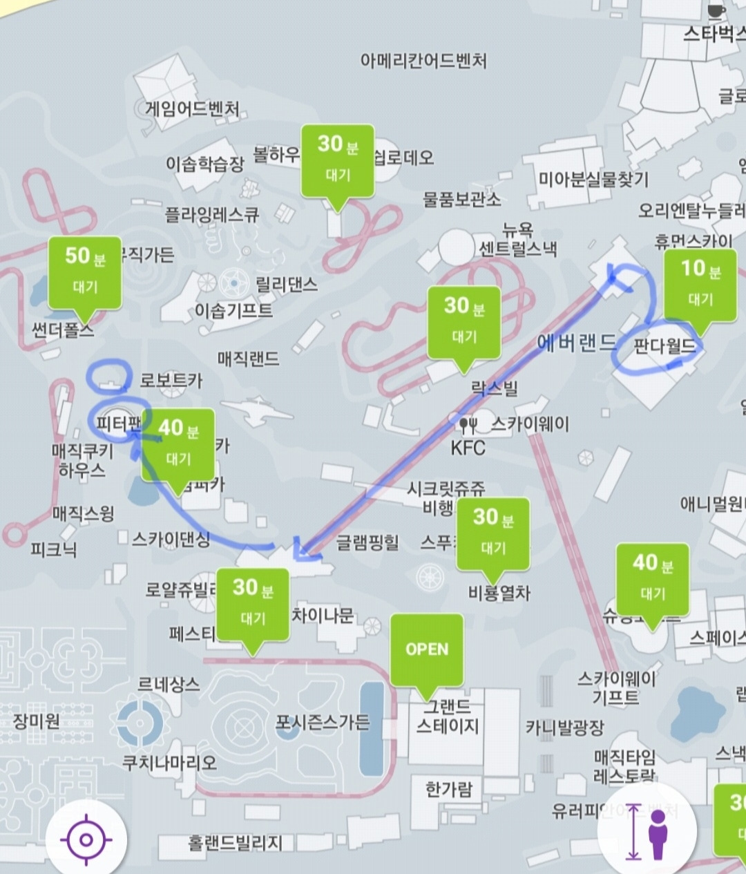판다월드->스카이 크루즈->놀이기구 존(피터팬/플래쉬팡팡)->7시 매직타임레스토랑->7시 30분 카니발 광장(퍼레이드공연)->8시 10분 장미원(불꽃놀이)