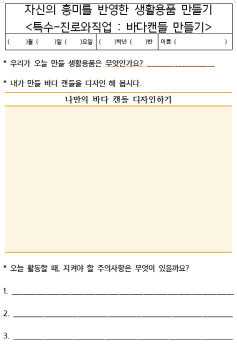 보조인력 없이 젤 왁스 인덕션에 녹이기는 저 혼자서는 너무 오래 걸리고(약한 불로 녹이는 거라), 학생들을 시키기에는 안전상 무리가 있었어요. 학생들은 학습지로 바다캔들 디자인을 마치고, 직접 꾸미기를 하는 동안 저는 젤왁스 녹이기에 돌입했는데, 시간이 지체되는 바람에 "(왁스를 받을 사람은) 줄을 서시오~~" 그런 상황(?)이 돼버렸어요.