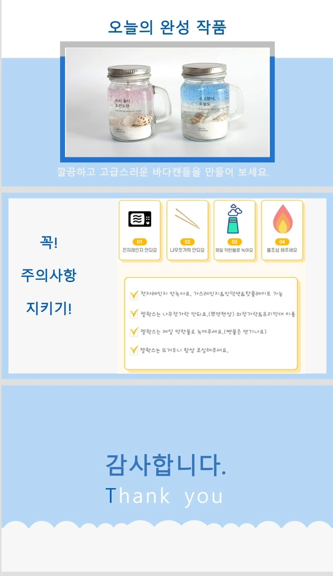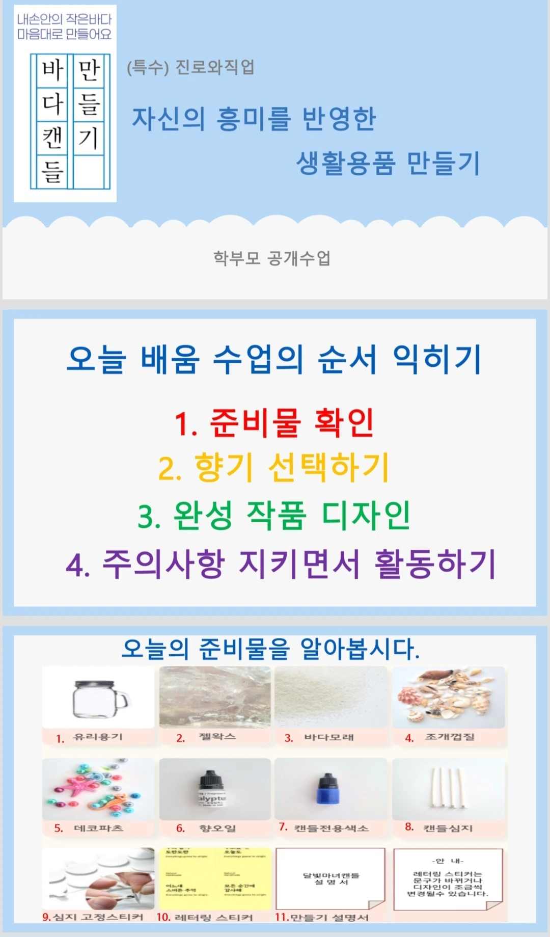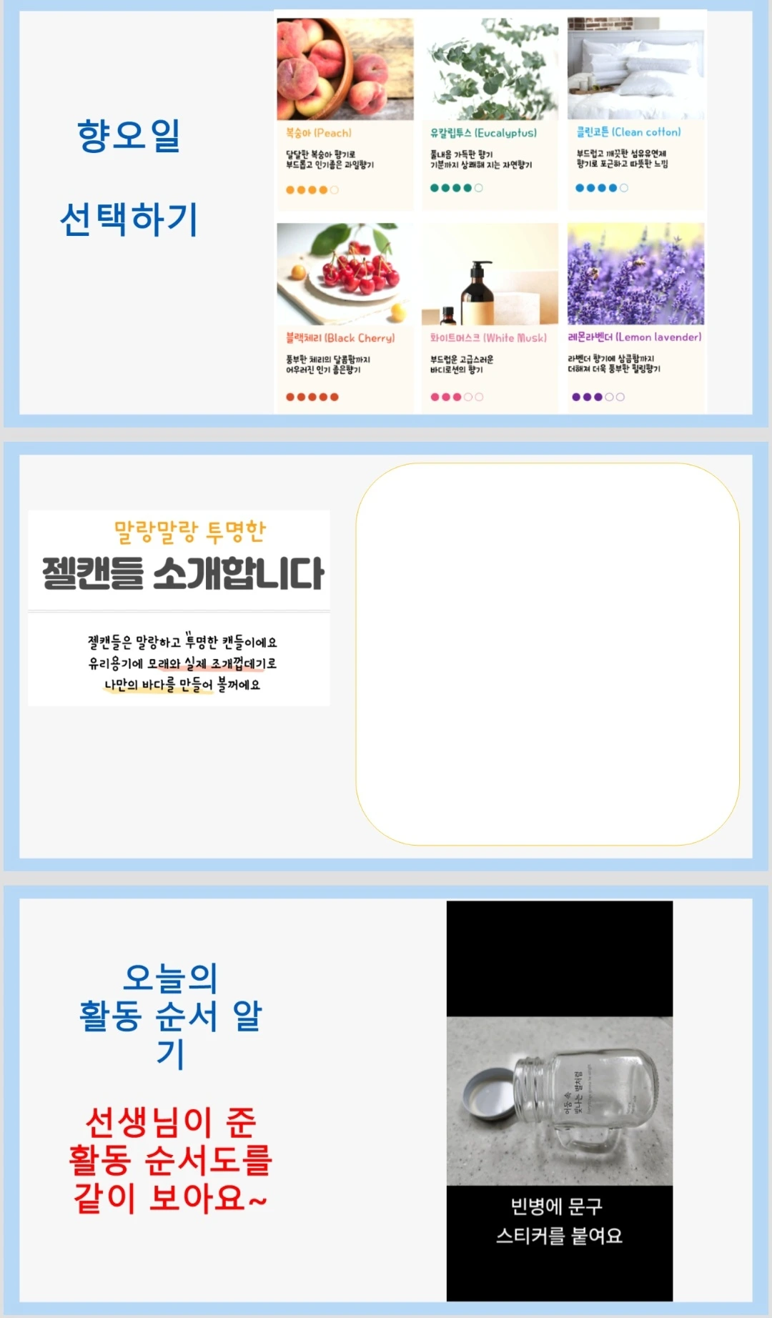 저는 향에 집중하는 수업이었어요. 4가지의 향을 선택하고, 향기 오일은 나눠서 써야 하기에 향기 맡아보고 정하는 활동도 했어요. 활동 중간에는 젤왁스를 녹이면 매캐한 향이 날 수 있기에 그런 안 좋은 향과 관련한 주의사항도 이야기 나눴어요. 저는 우당탕탕 실수 연발 공개수업이었지만, 다들 학생들과 더 의미 있는 수업 하시길 바랍니다.