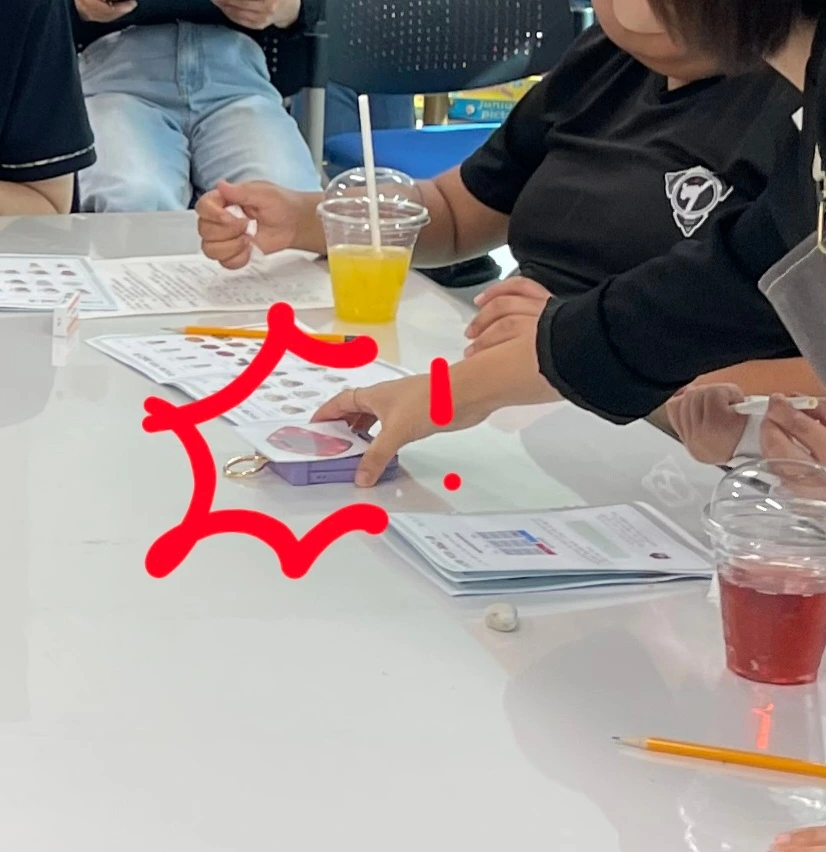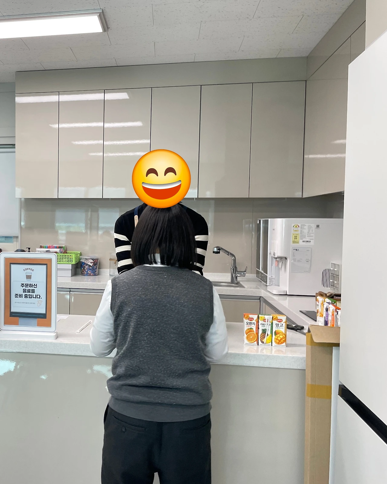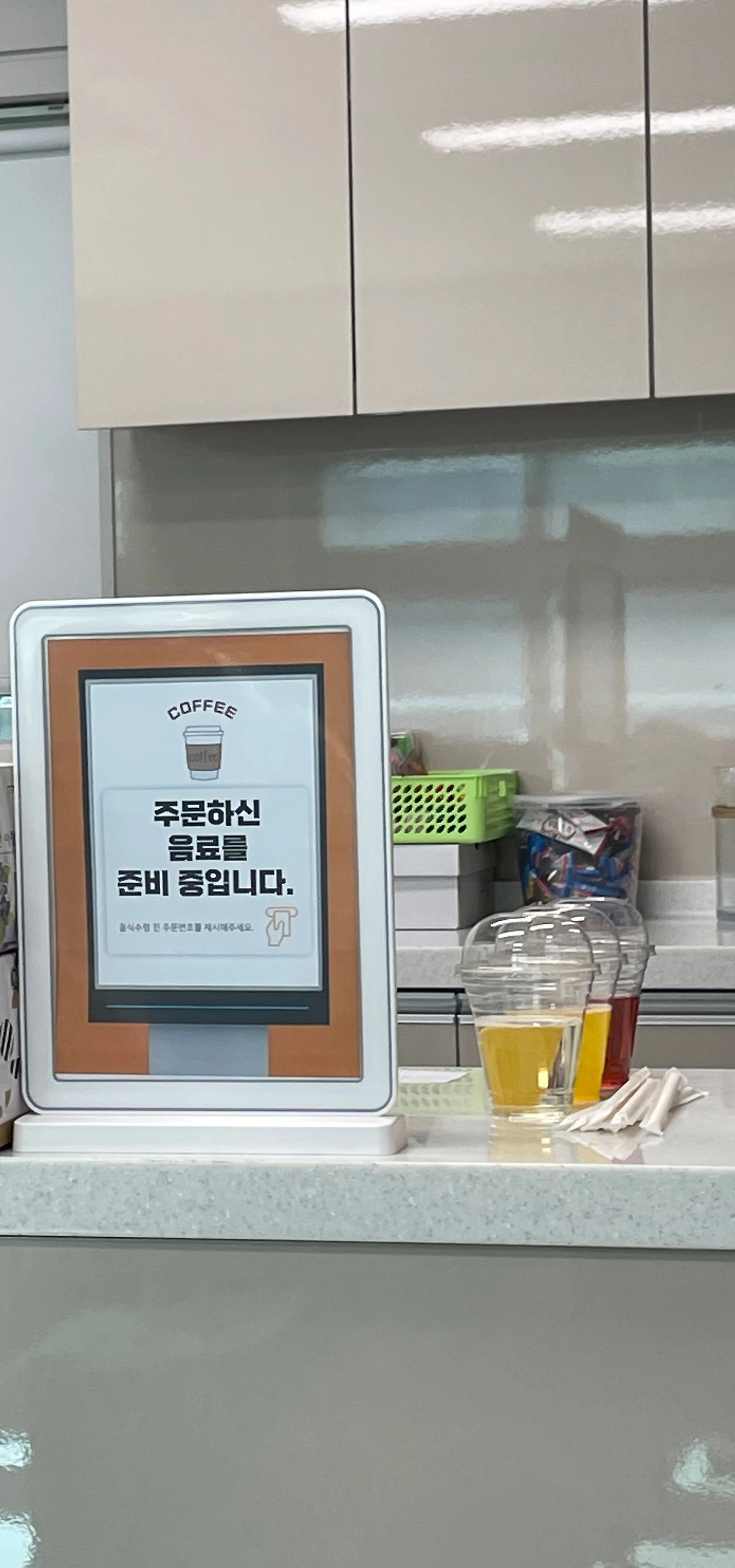 자원봉사자 선생님이 커피 수령하는 싱크대에서 주스를 테이크아웃 잔에 넣어서 빨대랑 같이 주시면서 "주문번호 1번 손님~ 음료 준비되었습니다." 크게 외치게 대사를 맞췄다. 그 순간 동시에 진동벨을 울리게 하면 정말 순간 깜쪽 같은 카페 모의수업의 디테일이 더 살게 된다.(진동벨은 반납하지 않고, 옆 친구에게 넘기도록 함)