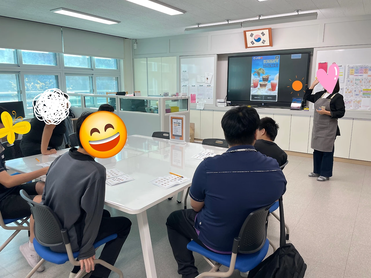 5. 정리 단계는 피치서가 "얼죽아"에 대한 쉬운 글을 읽어 주면서 오늘 배운 커피 메뉴에 대한 신조어를 이용해서 이야기 나누었다. 아, 아직 어린 중학생들이기에 커피 대신에 랜덤 주스로 메뉴를 바꿨다고 활동 순서 안내 할 때 미리 공지했었다. 랜덤 주스를 받고, 무슨 맛인지 맛보는 재미랑 '얼죽아, 아아' 등 학생들이 알고 싶어 할 만한 내용들에 대한 집중도도 꽤 높았다.