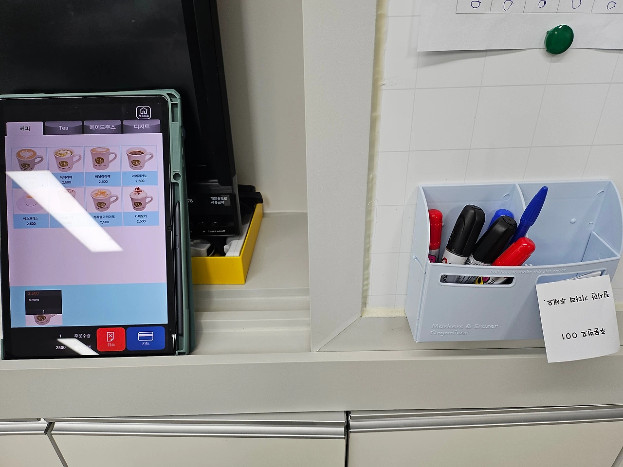 3. 태블릿 키오스크 체험을 직접한 학생은 내가 빌려준 신용카드 IC칩이 있는 부분을 칠판옆 마커펜 통구멍 뚫린 곳에 직접 넣기로 했다. 그리고 주문번호를 하나씩 뽑아가기로 했다.