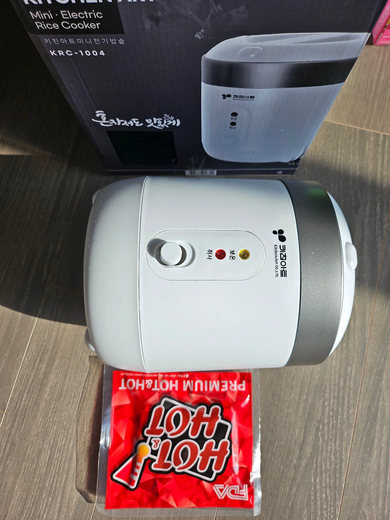 *미니밥솥 고민 많았는데, 기본 주방이 있어서 준비할 동안 1.5인분 밥 해서 김+밥 정도 조금씩 먹으니 딱 좋았어요. 생각보다 작아서 자리 차지 많이 안 해요.(핫팩 크기랑 비교샷. 전기장판이랑 밥솥이 크기 비슷) 햇반 8개+쌀 1킬로+미니밥솥. 저희 가족은 다 먹고 왔어요~ 네이버로 3만 원 정도 구입한 듯.