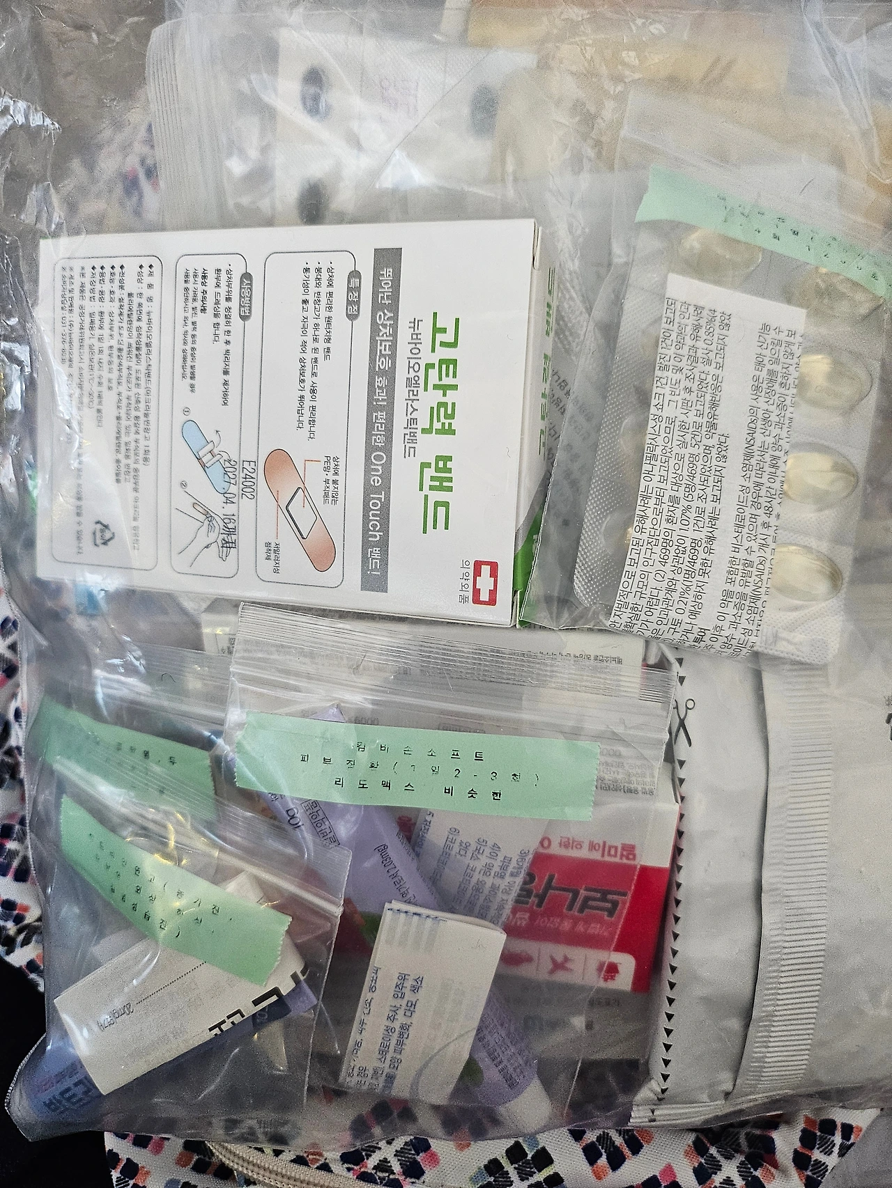 6. 라벨지 붙여 비상약 지퍼백-아이 비염약, 해열진통제, 종합감기약, 지사제, 소화제, 파스, 연고 2종(박테로신, 리도맥스류), 두드러기 알레르기약, 멀미약, 혼합밴드