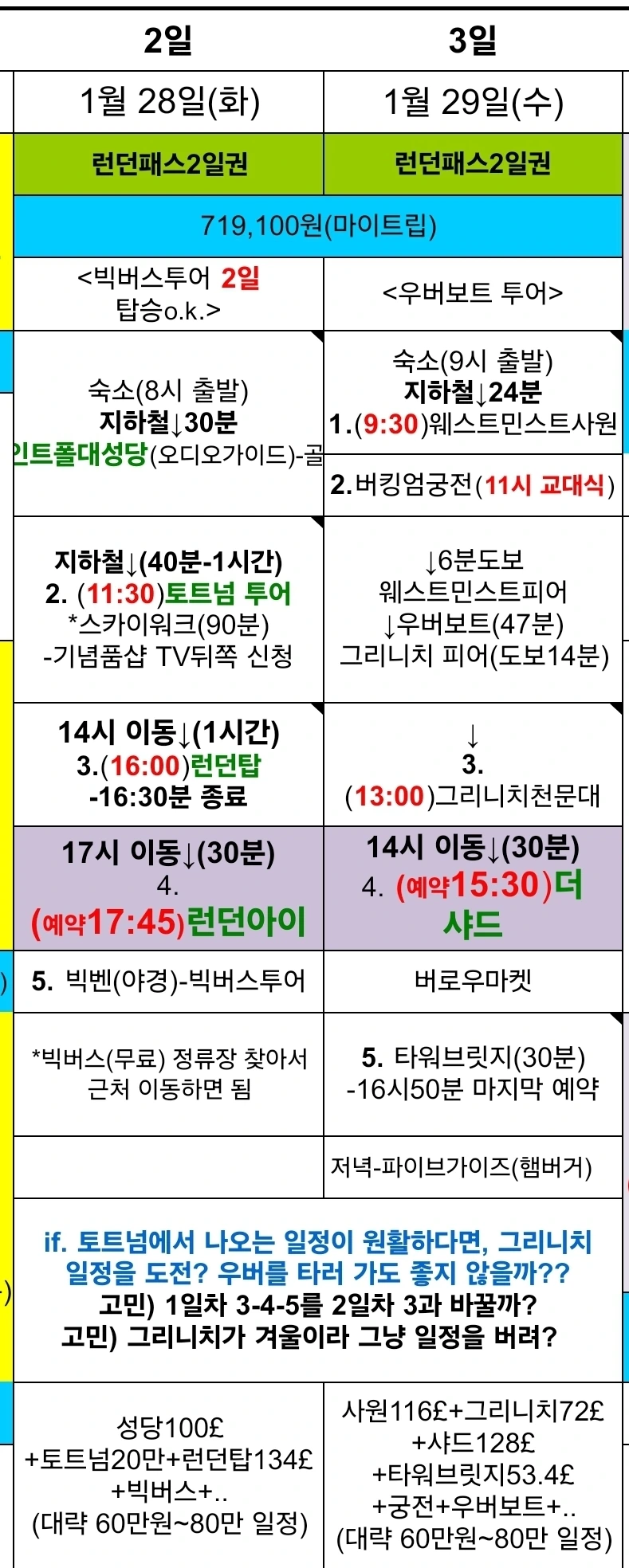 *버킹엄궁전 패스했어요. 런던패스 있어도 버킹엄궁전 교대식을 내부에서 관람하려면 따로 예약해야해요.(수금인가? 교대식 요일이 따로 있어요) 출발전에 날짜보시고 예약하세요. 저흰 도착해서 예약창 보니 29일은 자리없고, 31일 파리 가야하는 날 2자리 있어서 그냥 일정상 접었습니다. 행진을 외부에서도 볼 수 있다는데.. 가족들이 관람객들 많고 무리해서 가지 말자고 해서 런던아이로 빅버스타고 가는거로 조율이 됐어요.