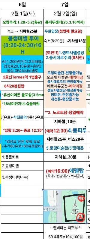 여행계획을 짜려니, 좀 무겁거나 강한 스케줄을 어디에 배치할까 고민했어요. 여행의 설렘이 있는 첫날 위주로 제가 넣었어요. 파리 근교 몽생미셸 수도원 투어가 호불호가 있던데, 겨울이라 야경까지 보지 못하고(요즘 전기세 절약차원에서 예전처럼 불 안 켜둠) 고민하다 프로 여행러 지인의 추천으로 감행했어요. 서울-부산 당일치기 정도 동선이래요.
