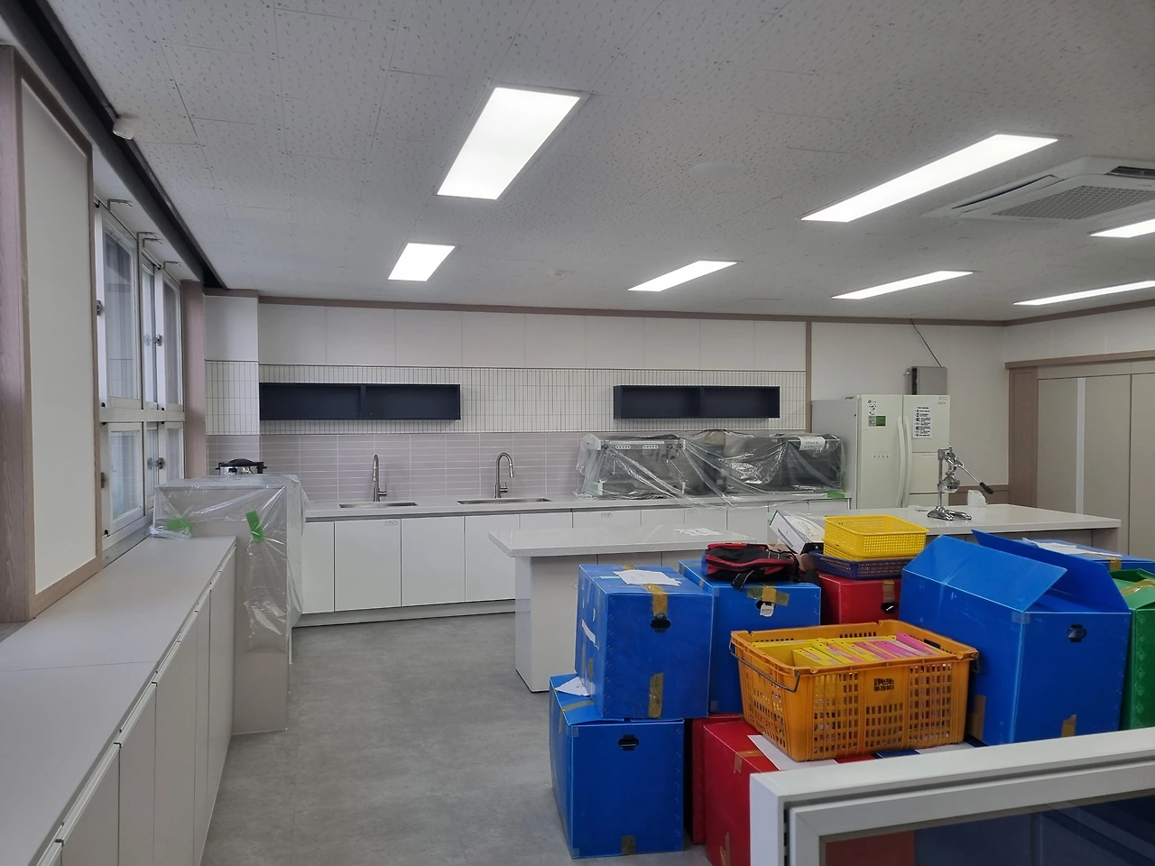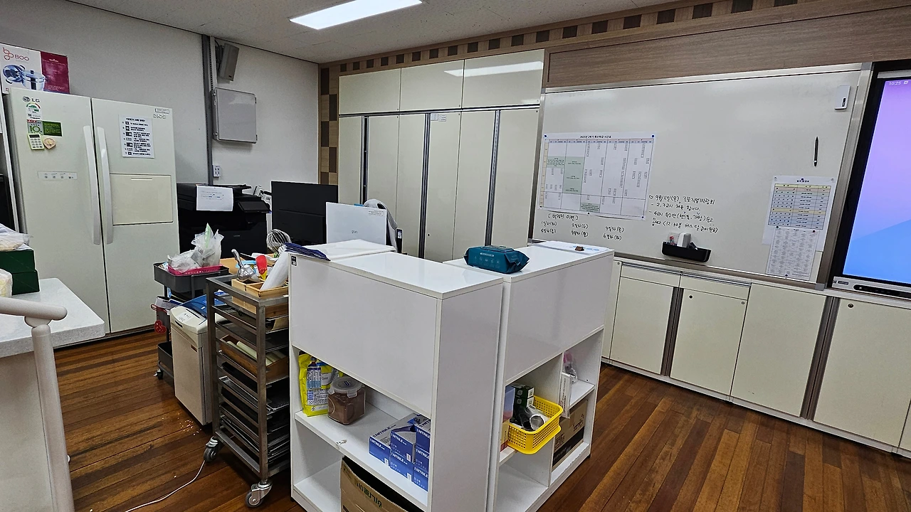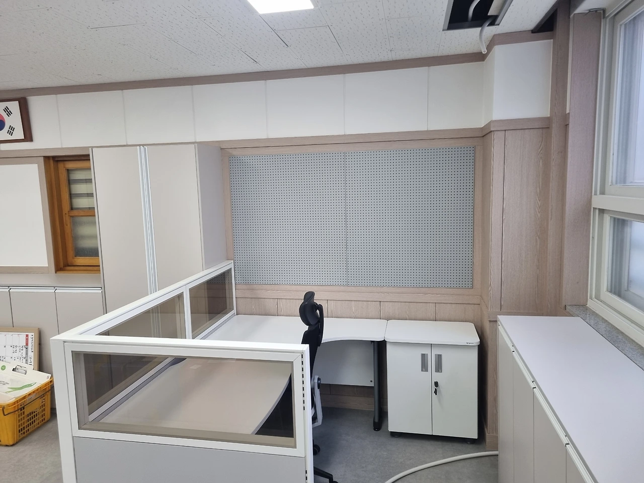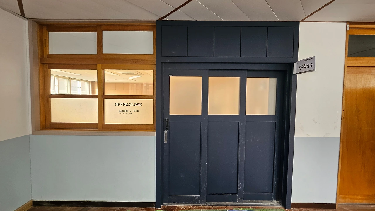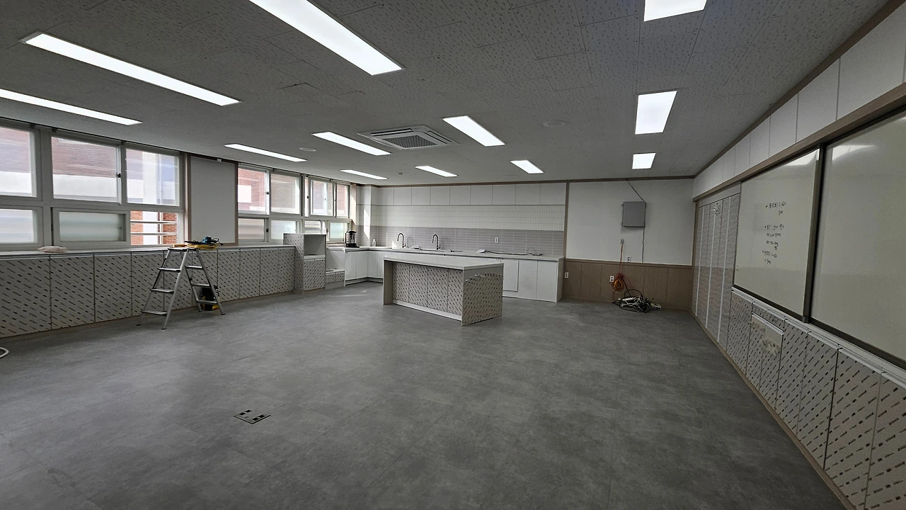 - 기존의 교실 연결 문을 막는 목작업 뒤에 벽면 타공판 설치하고, 자리를 옮겼어요.
