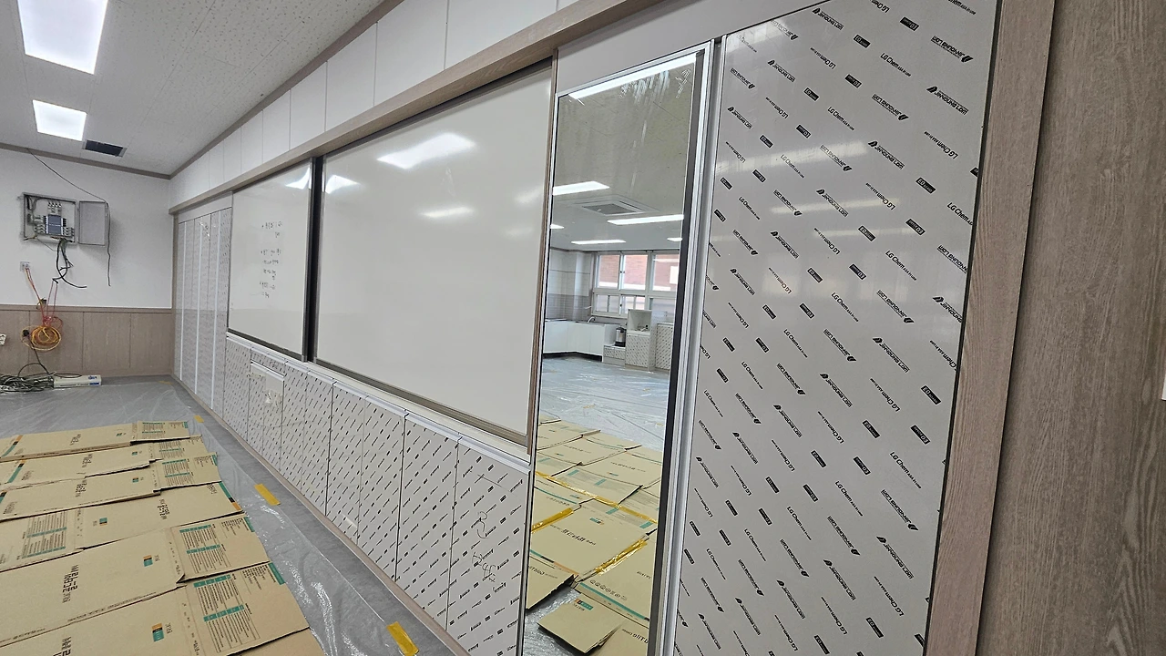 - 이 전면장을 여름방학 때 전자칠판 설치하느라 수리한 거였거든요. 그래서 또 예산 쓰기가 부담이라 구조는 살렸습니다.