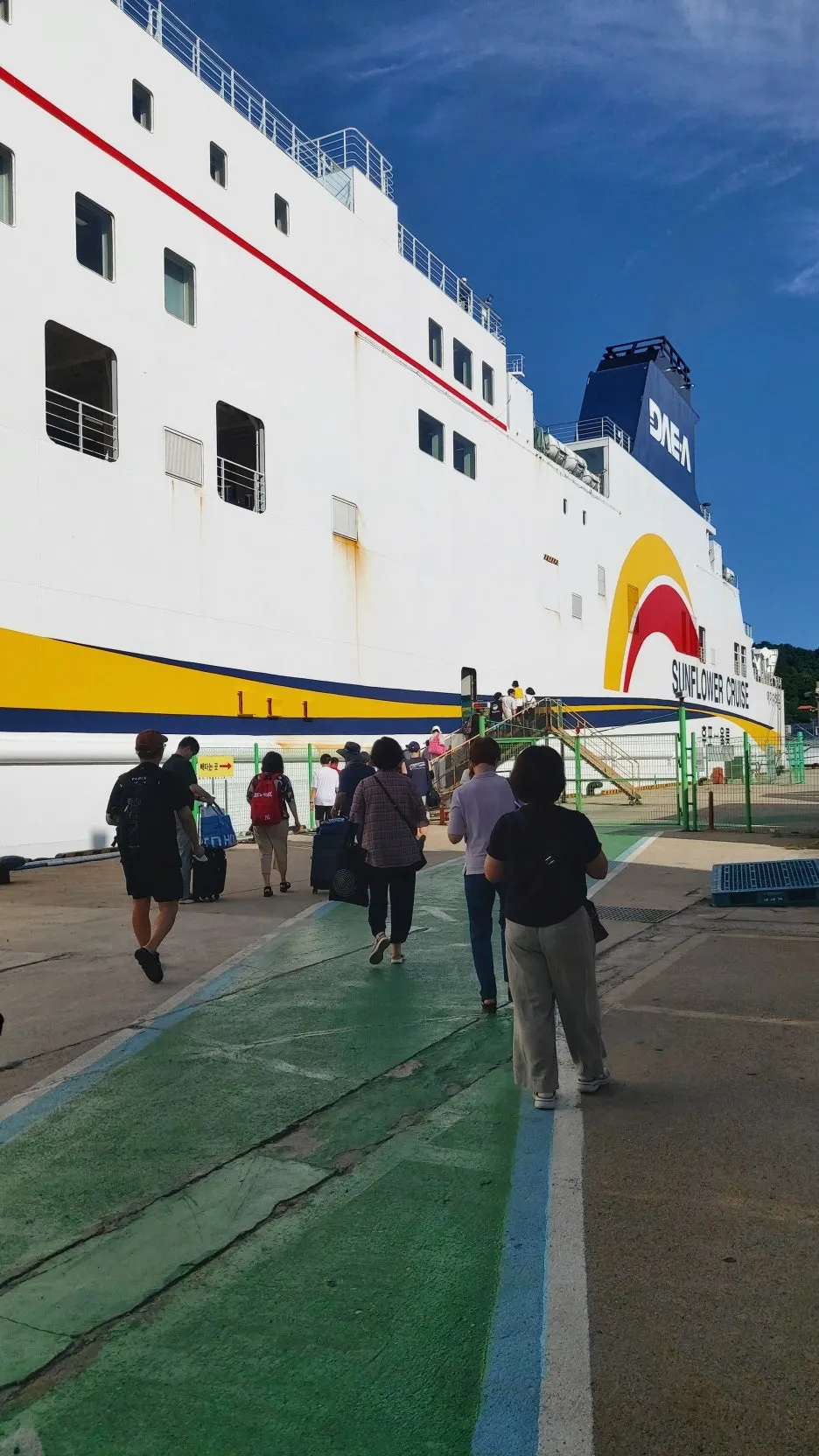 배는 후포항에서 8시에 출발 예정이었습니다. 대구, 구미, 안동, 영주서 온 친구들이 모두 후포항에 모였습니다. 차를 선적하고 아침으로 여객선 터미널 근처 식당에서 황태 콩나물국을 먹었습니다. 큰 배 안으로 이어진 줄을 따라 들어갔습니다. 우등 서이라 의자도 젖혀지고 발받침도 있고 앞뒤 공간도 널찍했습니다.