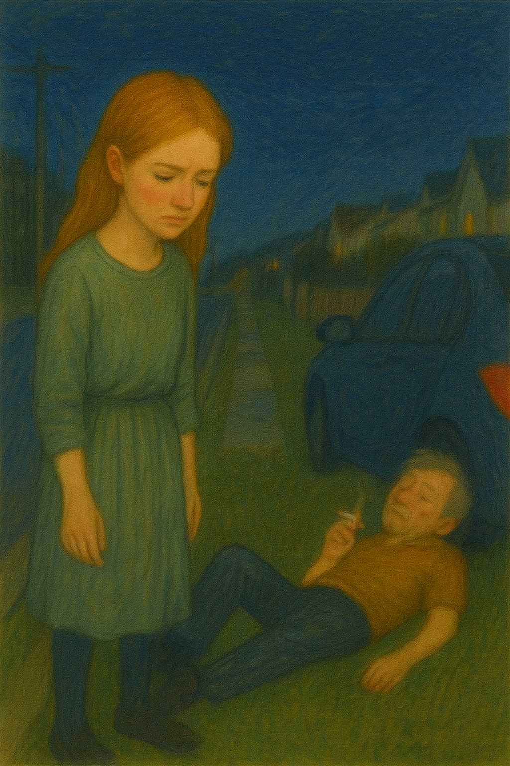 그는 비틀거리며 겨우 몸을 일으켰다. 그러더니 잔디 위에 주저앉아, 차 안에서 못 피운 담배를 입에 물었다. 그대로 옆으로 쓰러지듯 구르는 모습.