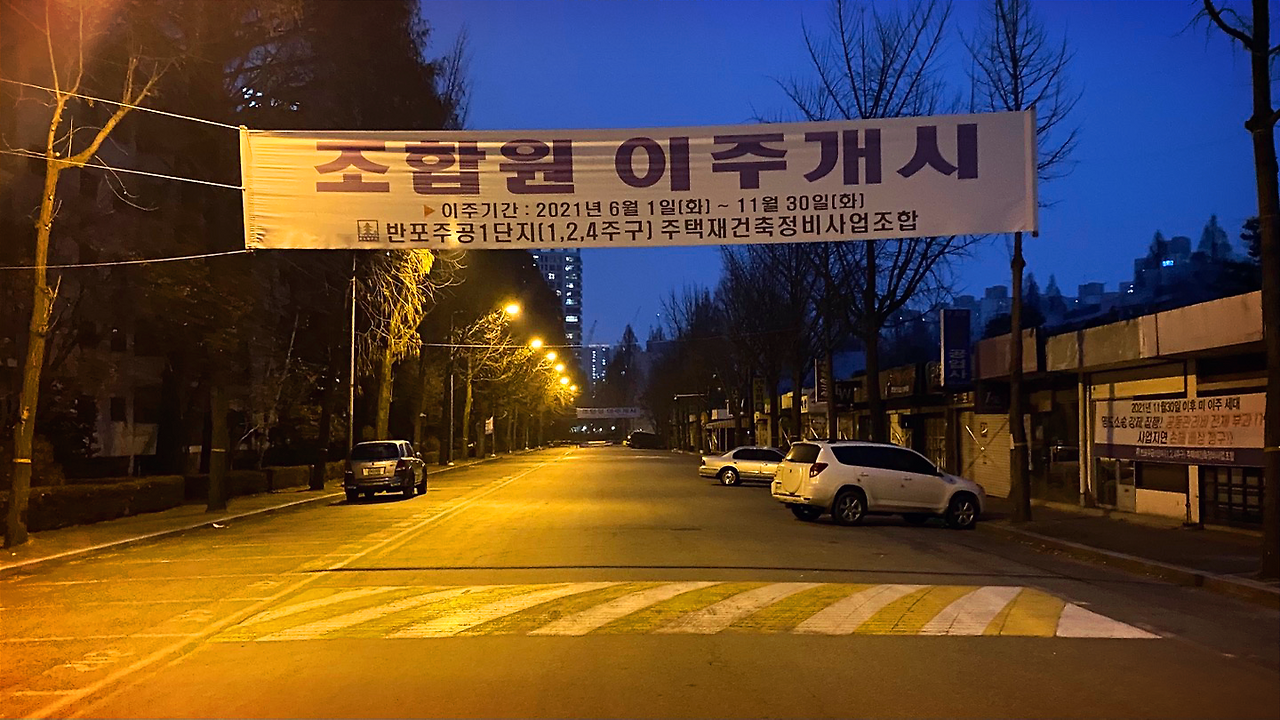 새로운 아파트가 들어서면 다시는 밟을 수 없을지도 모르는 이곳을 한 발짝 한 발짝 나름 꾹꾹 밟아가며 둘러보았다. 더 이상 사람이 살지 않는다는 '공가' 표시가 붙지 않은 집이 없었고, 영업을 하고 있는 상가 건물 또한 보기 힘들었다. 마치 몇 달 전까지 사람이 거주하던 공간이라는 사실을 잊을 만큼 사람의 흔적은 너무나도 빠르게 지워진 모양이었다. 단지 내 도로 위를 가로지르는 '조합원 이주 개시'라는 크나큰 현수막만이 2021년 하반기까지는 이곳에 사람들이 거주 중이었다는 사실을 상기시켰다. 재건축은 머지않아 보였다.