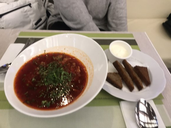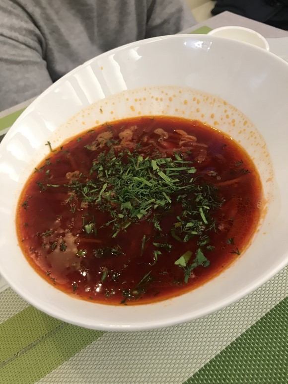 해당 식당에서는 보르쉬와 국물 요리를 주문해 먹었다. 보르쉬의 경우 앞서 말씀드렸듯 식당마다 레시피가 천차만별인 관계로 기존 스테이크 하우스에서 주문한 보르쉬와는 다른 맛이 났다. 사워크림도 덜어 넣을 수 있도록 분리되어 있었으며, 곁들여 먹을 빵 조각도 서빙되었다. 보르쉬에 대해서 우리나라 사람들에게 소개할 때 '러시아의 김치찌개'라는 말을 하고는 한다. 개인적으로 보르쉬에서 김치찌개의 맛을 느낀 적은 없지만 해당 식당의 보르쉬는 왜 김치찌개와 비슷한 맛이 난다고 하는지 이해가 될 뻔하기도 했다. 그래도 역시, 보르쉬는 보르쉬다.