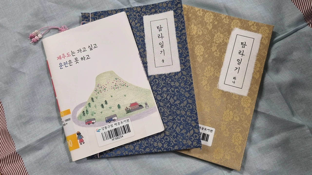 일기 쓰기를 좋아하는 사람으로 제일 먼저 고른 책은 [바리스타의 일기]인데 판형이나 내용은 보통의 서적들과 다르지 않아 보였다. 독립 출판물은 독특한 구성과 판형 등으로 정체성을 확립하는 경우도 있지만 많은 책들은 평범한 외양으로 독자를 기다리곤 한다. 처음 눈에 띄는 것은 겉모양이 화려한 책이지만 오래 볼 책은 그래도 내용이 좋은 책이기에 단정한 책의 모습에 마음이 쓰였다. 어쩌면 나 역시 이런 평범한 책 안에 내용을 넣는 방법을 택할 수밖에 없다는 동지애였는지도 모르겠다. 그 책을 집어 들고 보니 그 곁에 또다른 일기가 두 권 있었는데 이 책은 외양이 무척 화려한 책이었다. 전통 제본 방식에 표구에 쓰일 법한 패브릭으로 표지를 만든, 내지는 선장제본이라 불리는 방식으로 꿰매어졌으며 그 안에 한지에 인쇄된 글과 그림이 아름다운 책 [탐라일기]였다. [탐라일기]는 총 두 권으로 베이지색과 남색 패브릭으로 곱게 단장되어 갖고 싶다는 소유욕이 절로 발동되었으나 두 권이면 4만원이라는 어쩔 수 없는 지갑 사정으로 그저 이런 책들을 빌려 볼 수라도 있게 해준 도서관에 깊은 감사의 마음을 느낄 뿐이었다. 그 외에도 블라인드 북으로 독립출판물을 한 권 더 가져왔는데 '이거슨 운명'이라는 표현에 맞게 집에 와 끌러보니 같은 작가의 제주도 버스 여행법을 담은 책이었다. 내가 [탐라일기]를 고를 줄 알았나? 내가 운전을 못한다는 것을 눈치챘나? 싶을 만큼 블라인드인데 블라인드 같지 않은 선택이 신기했다.