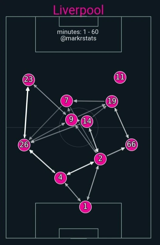 끝으로 리버풀의 패스맵을 가져왔다. 좌우 반전해서 생각하면 새로운 전술과 매우 비슷하다. 리버풀은 왼쪽 위주로 빌드업을 하고(전술은 오른쪽 위주), 오른쪽에 있는 살라에게 1대1 찬스를 만들어 주는 전술을 사용한다(왼쪽 윙어가 1대1). 살라는 오른쪽 윙어인데 왼발잡이인 것도 마찬가지로 반대로 생각하면 된다. 대신 좌우가 쏠리지 않고 균형을 이루고 있는 거랑 원톱(9번)이 굉장히 내려오는 게 차이점이다.