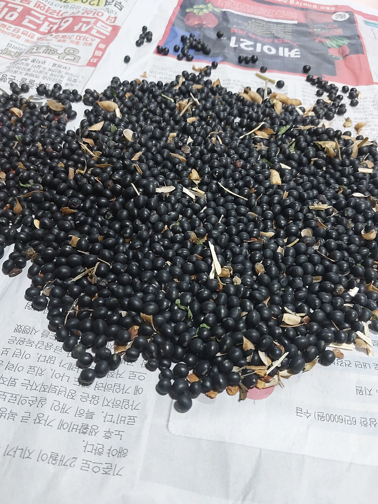 검불과, 상태가 좋지 않은 콩이 섞여있는 쥐눈이콩을 탁자 위에 살살 쏟아놓았다. 일손이 모여 있을 때 어서 마무리하고 싶어서.