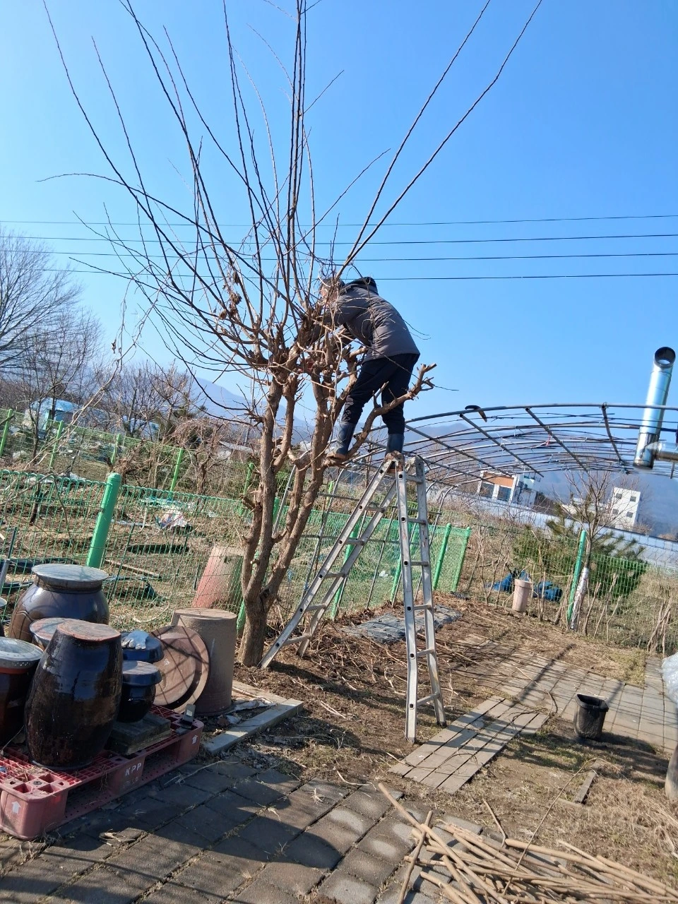 아까 슬며시 밖으로 나갔던 남편은 사다리에 올라 꾸지뽕나무를 전지 해주고 있다.
