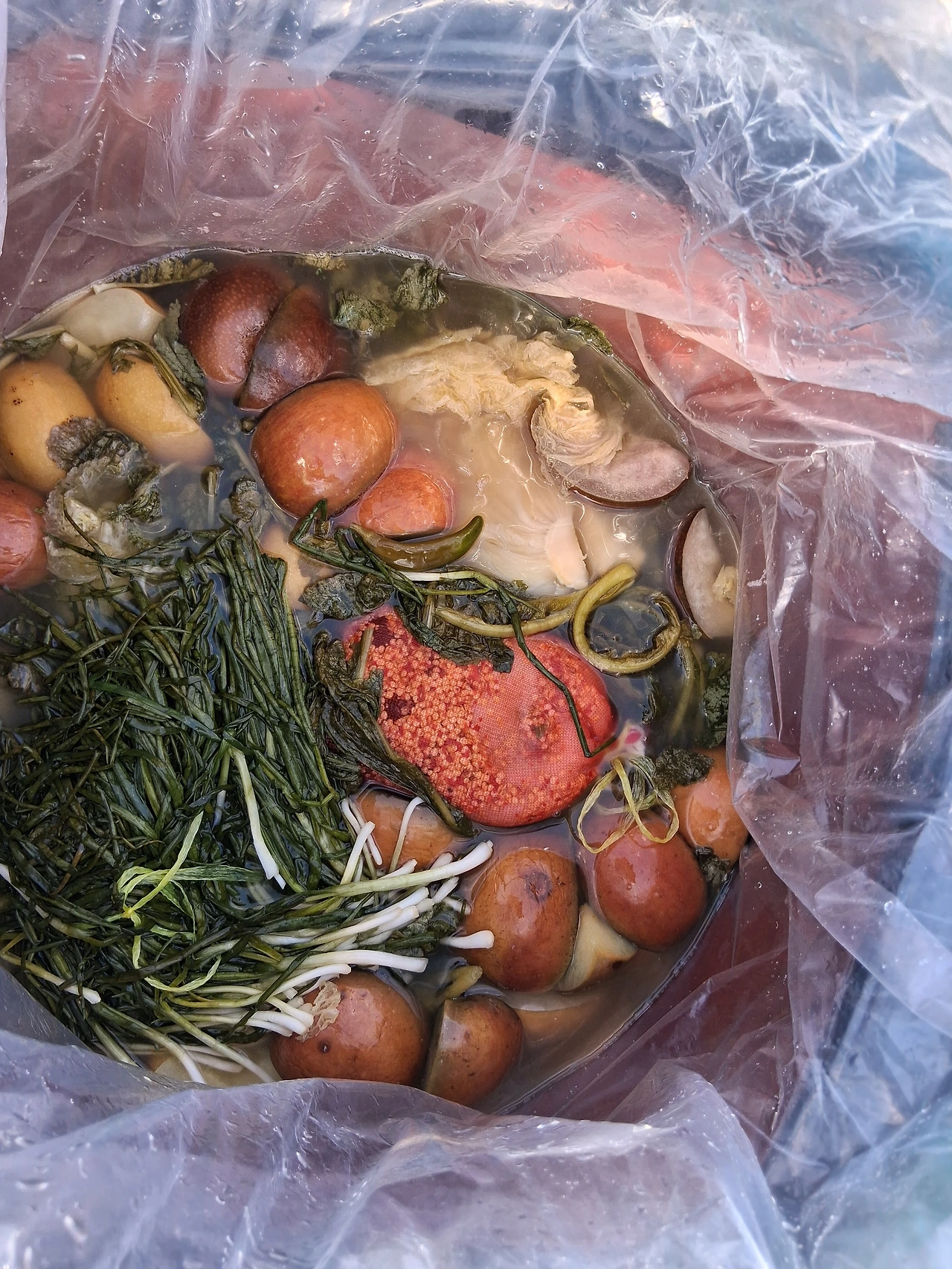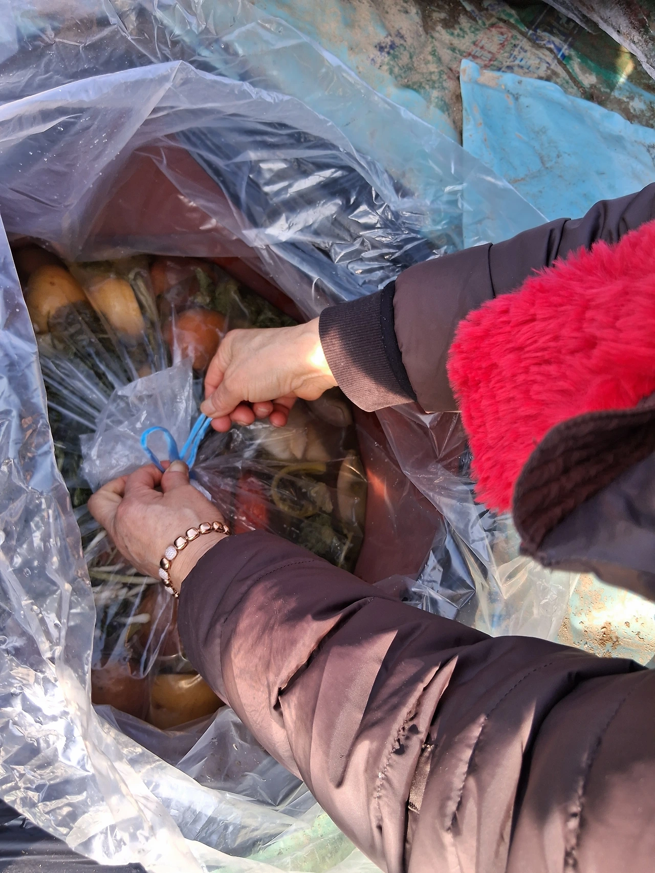 농막 탁자에 있는 휴대폰을 들고 그리로 다시 뛰었다. 그녀가 기다려주었다. 내가 카메라를 들이대자 그녀가 나를 배려해 동치미 봉지를 바깥쪽으로 더 넓게 펴주었다.