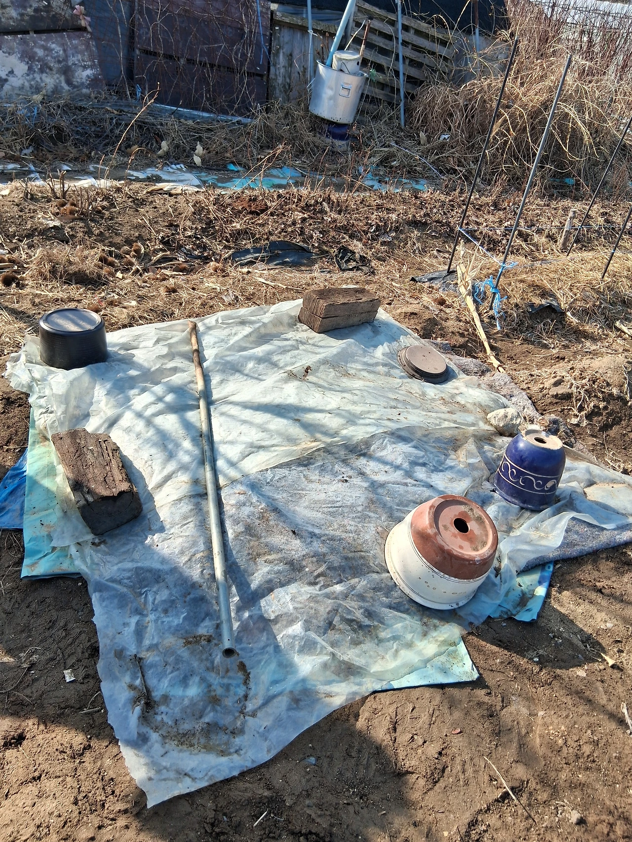 일을 마친 그녀가 플라스틱 뚜껑을 덮고 납작한 종이 상자를 덮고 비닐을 덮고 그 위에 돌 화분, 쇠 파이프, 나무둥치 돌 등 무거운 기구로 눌러놓았다.