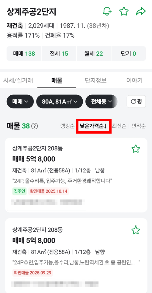네이버 부동산(네이버페이) 매물을 볼 때는 항상 낮은 가격순으로 정렬하자.