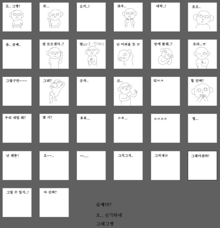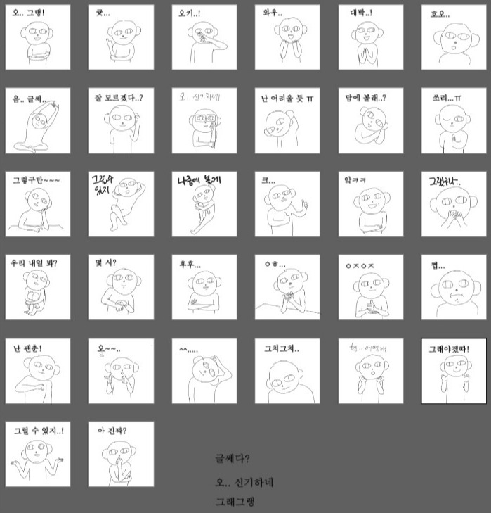 생각나는 대로 하나씩 이미지를 채워본다그다음, 리액션 하나하나씩 어울리는 모션을 문구와 맞추어 짜 나간다. 무려 32개나 되니 시안 그리는 것도 쉽지 않았다. 그려본 사람은 알겠지만, 32장? 정말 많다. 막상 구매자의 입장에서는 그렇게 많게 느껴지진 않겠지만.. 시안 제작도 꾸물꾸물하다 보니 4~5일 정도 소요되었다. 아무래도 문구와 모션을 각기 다르게 만들어야 했기에 좀 까다로웠다. 미묘한 표정의 차이, 말의 차이를 생각하면서 b급 감성 살려보려고 애쓰는 과정이었다.
