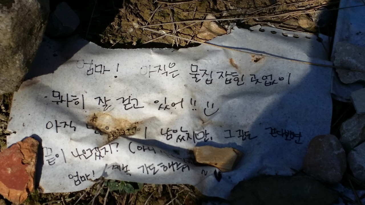 비닐로 감싸고 돌로 눌러 놓은 정성이