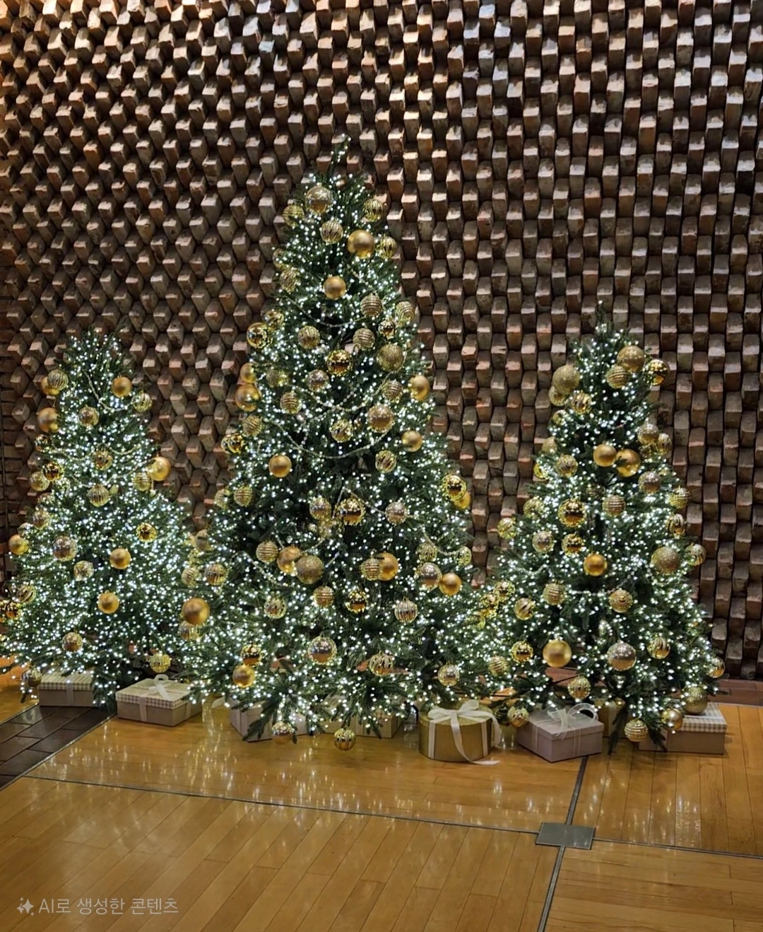 그 안에 크리스마스트리가 세 그루 서 있다.