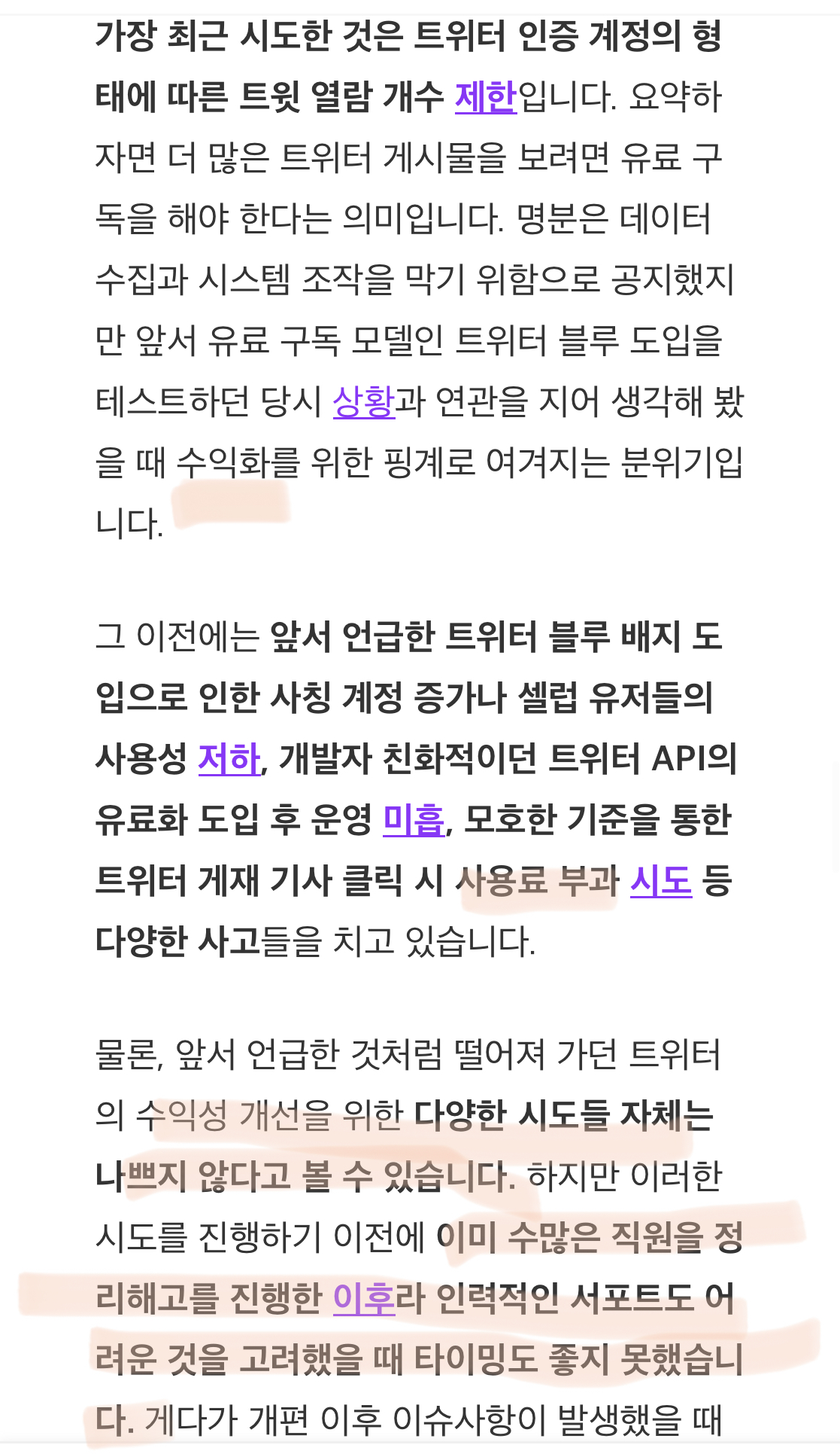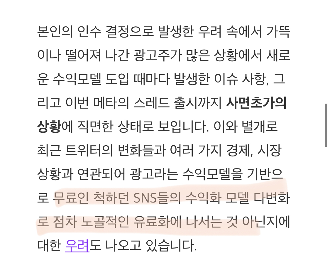 그런데 마냥 비웃고 넘길 수가 없다. 내가 만약 트위터의 대표였다면, 어떤 선택으로 지금의 어려운 상황을 헤쳐나갔을까를 생각해 보면 뾰족한 수가 떠오르진 않기 때문이다.