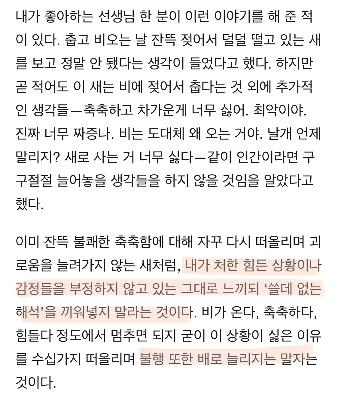 굳이 이 상황이 싫은 이유를 수십 가지 떠올리며 불행 또한 배로 늘리지는 말자는 것이다. 감명 깊었다.