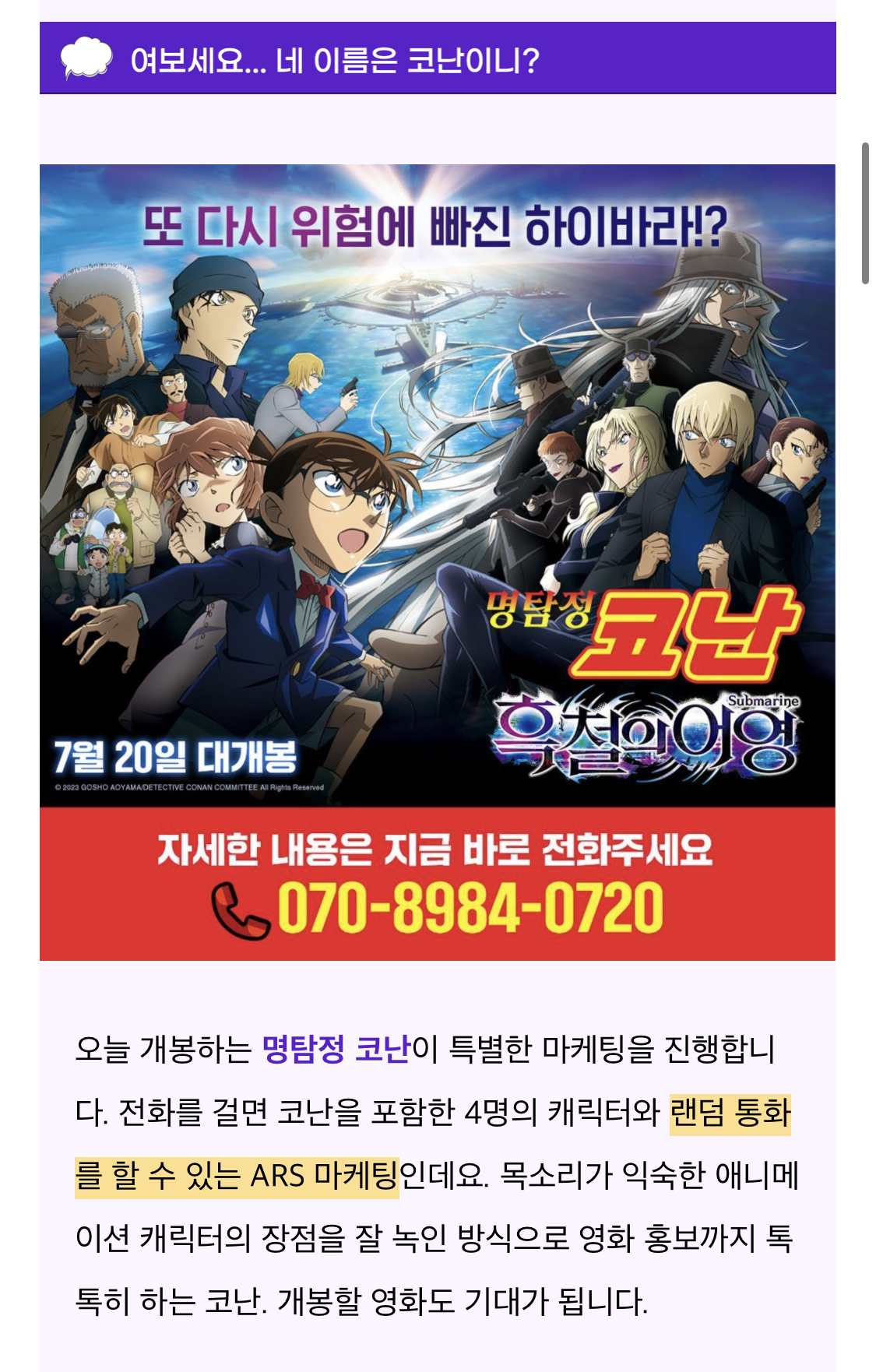 코난 흑철의 어영 개봉을 앞두고 신박한 마케팅 사례인 것 같다. 전화를 걸면 4명의 캐릭터 중 한명과 랜덤 통화를 할 수 있는 ARS 마케팅!! 직접 해봤는데 재밌었다.. ㅋㅋㅋ