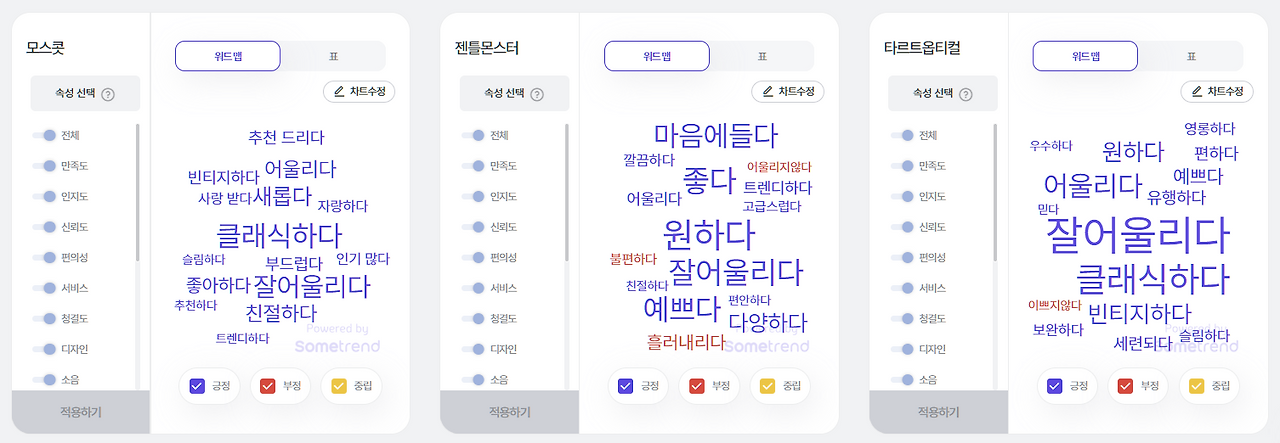 젠틀몬스터는 평이 많은 대신, '불편하다' '어울리지 않다' '흘러내리다'의 의견도 존재한다는 것을 알게 되었습니다. 타르트옵티컬도 '이쁘지 않다'는 부정 언급이 존재하네요..! 반면, 모스콧은 언급량도 꽤 높고 긍정 언급이 주를 이루고 있었습니다.
