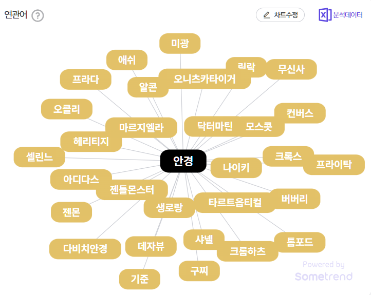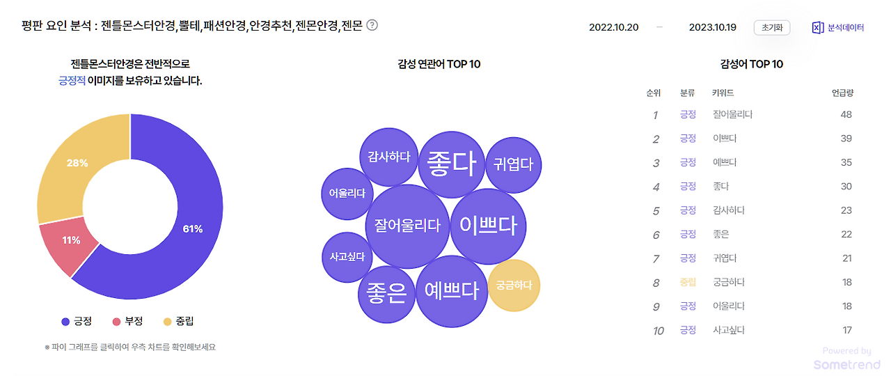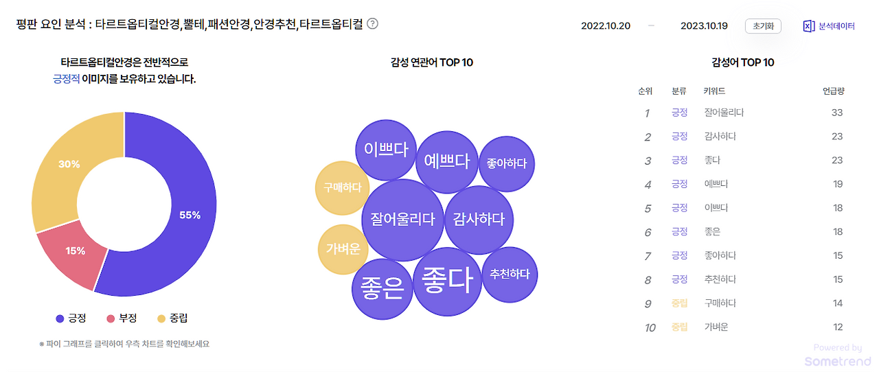 그래서 이번에도 썸트렌드의 도움을 받아서 사고 싶은 안경을 발견해 볼까 합니다. 패션 아이템은 실착용 후기가 중요하니, 유튜브 속 데이터도 활용해서요. 각종 SNS에 흩어진 사람들의 리얼 보이스를 탐색하기엔 역시 썸트렌드만 한 게 없는 것 같습니다. 보기 좋게 데이터를 추려 주니까요.