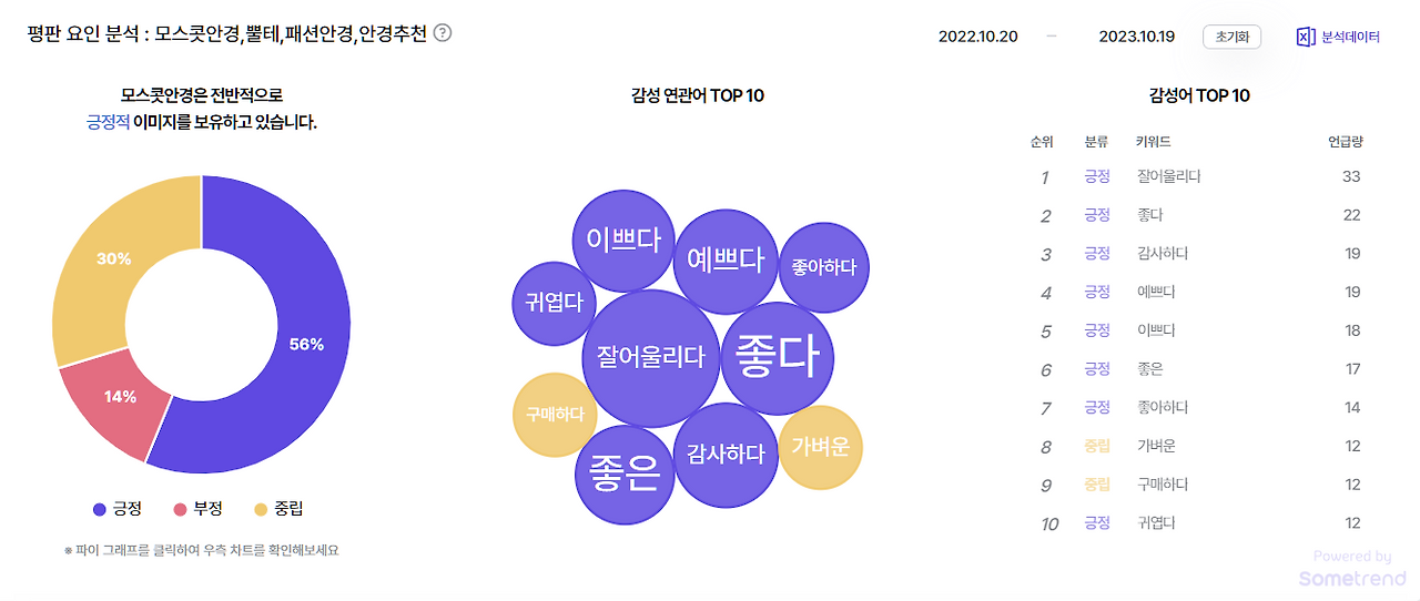 유튜브 상 언급된 모스콧 안경의 이미지는 긍정이 56%, 중립이 30%, 부정이 14% 정도이더군요.