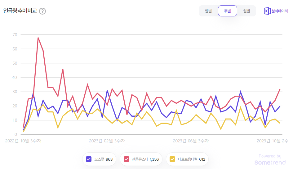 SNS 상 언급량으로 인지도와 인기 정도를 가늠해 볼 수 있기 때문에, 언급량을 비교해 보았습니다.