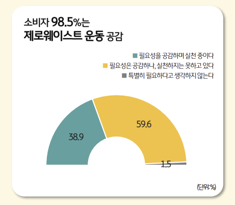소비자 98.5%는 제로웨이스트 운동의 필요성에 공감하지만, 그중 60%는 실천하지 못하고 있다고 응답하였습니다.