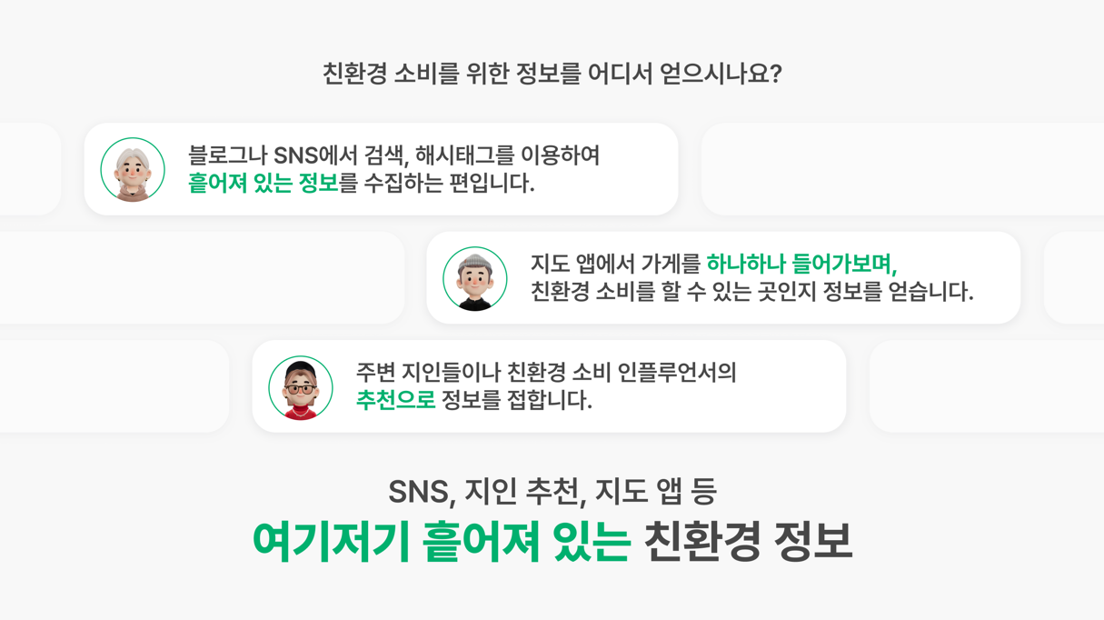 우리는 이렇게 지구와 나의 삶을 이롭게 하는 정보를, 애써서 힘들게 찾아야만 접할 수 있습니다. 또 이 정보들은 웬만큼 마음을 굳게 먹지 않으면 접하기 어렵습니다. 블로그, 인스타그램, 유튜브, 지인 추천 등 다양한 곳에 흩어져 있거든요.