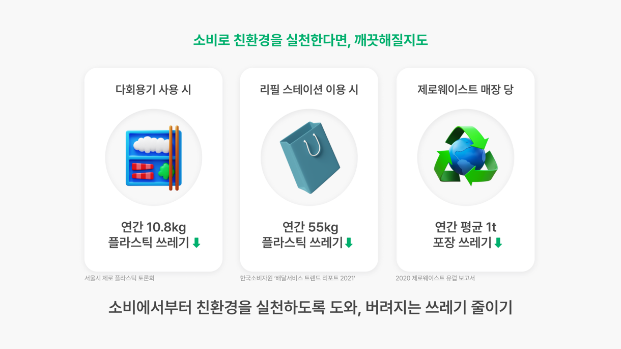 많은 사람들이 더욱 손쉽게 낭비 없는 소비를 할 수 있는 환경이 만들어져야, 쓰레기가 줄어들고 환경이 깨끗해질 수 있을 것이라 생각합니다. 일상 속 개인의 친환경 실천을 어떻게 도울 수 있을지 고민하며 만들어 본 서비스입니다. 이를 통해 친환경을 향한 작은 관심을 큰 실천으로 이끌 수 있다면 정말 보람찰 것 같습니다.