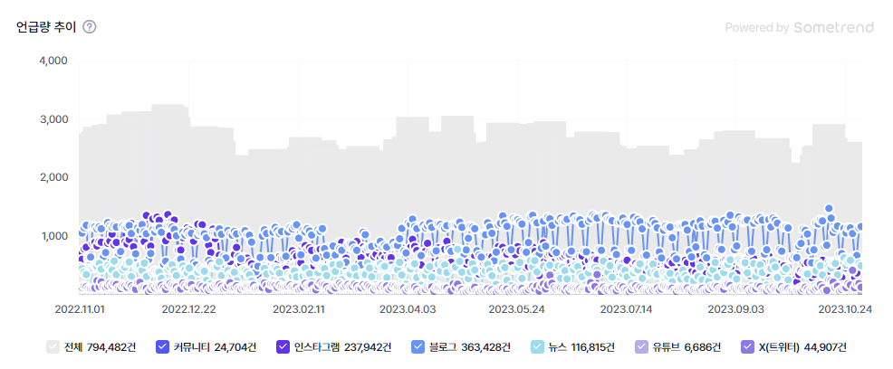 썸트렌드로 알아본 결과, 1년 간 무려 79만여 건의 친환경 관련 게시글이 SNS에서 조회됩니다.