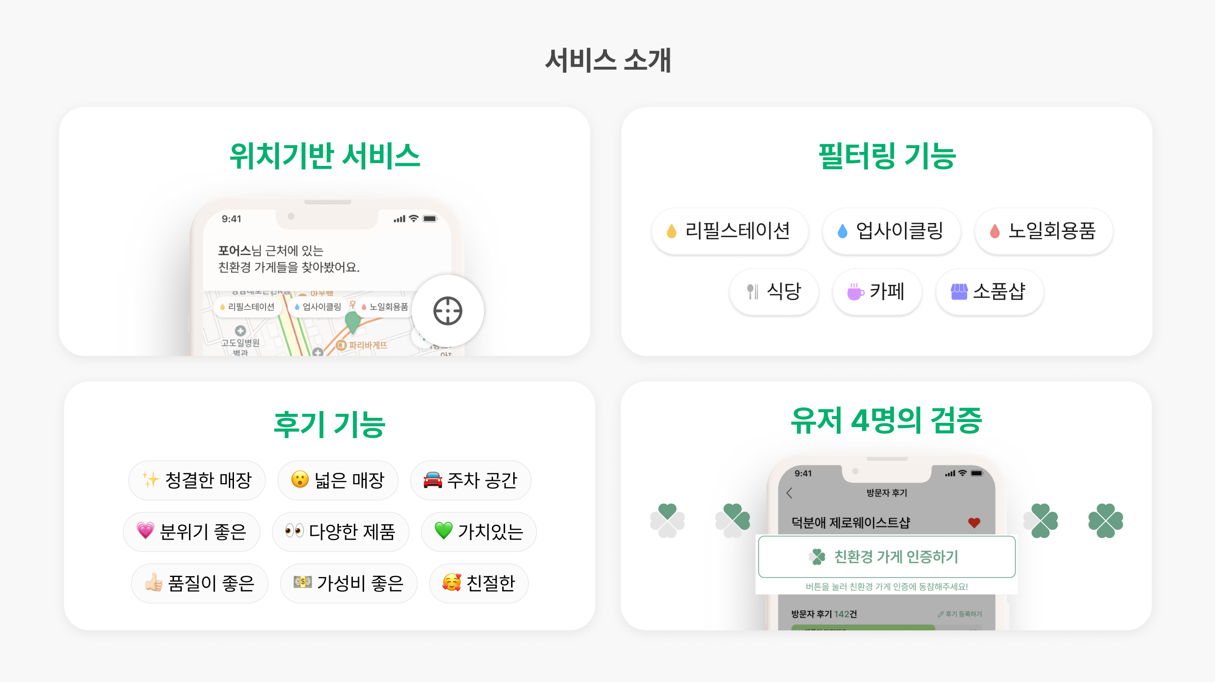 앱 사용자는 누구나 친환경 가게를 지도에 제보하고, 인증할 수 있습니다. (4명의 인증으로 가게가 정식 등록됩니다)