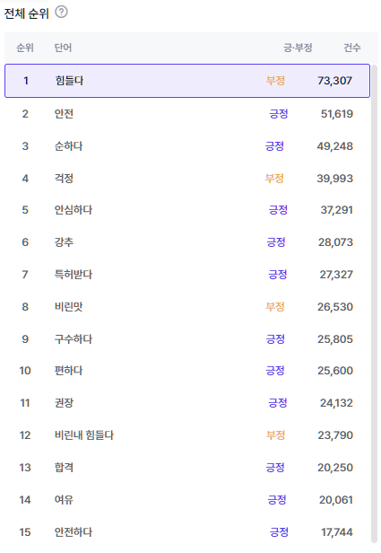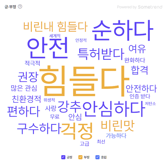 이는 SNS 빅데이터로도 확인되는 결과입니다. 친환경 소비에 높은 관심을 보이는 반면, '힘들다'는 부정어가 감성 연관어 1위로 랭킹 되었기 때문입니다.
