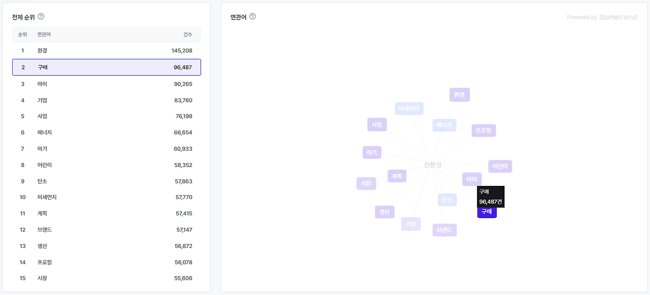 그 답을 '소비' '구매'에서 찾았습니다. 썸트렌드로 사람들의 리얼 보이스를 모아보니, '구매'가 친환경 연관어 2위에 랭킹 되어 있는 것을 볼 수 있었습니다.
